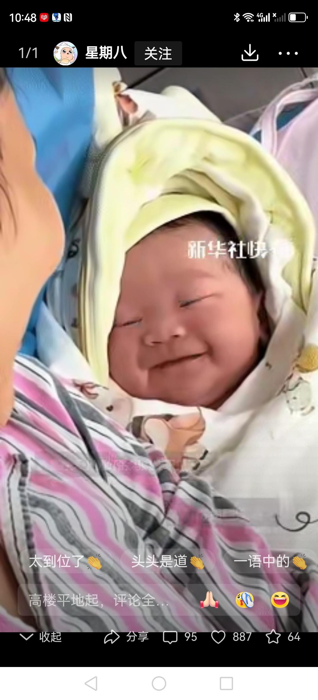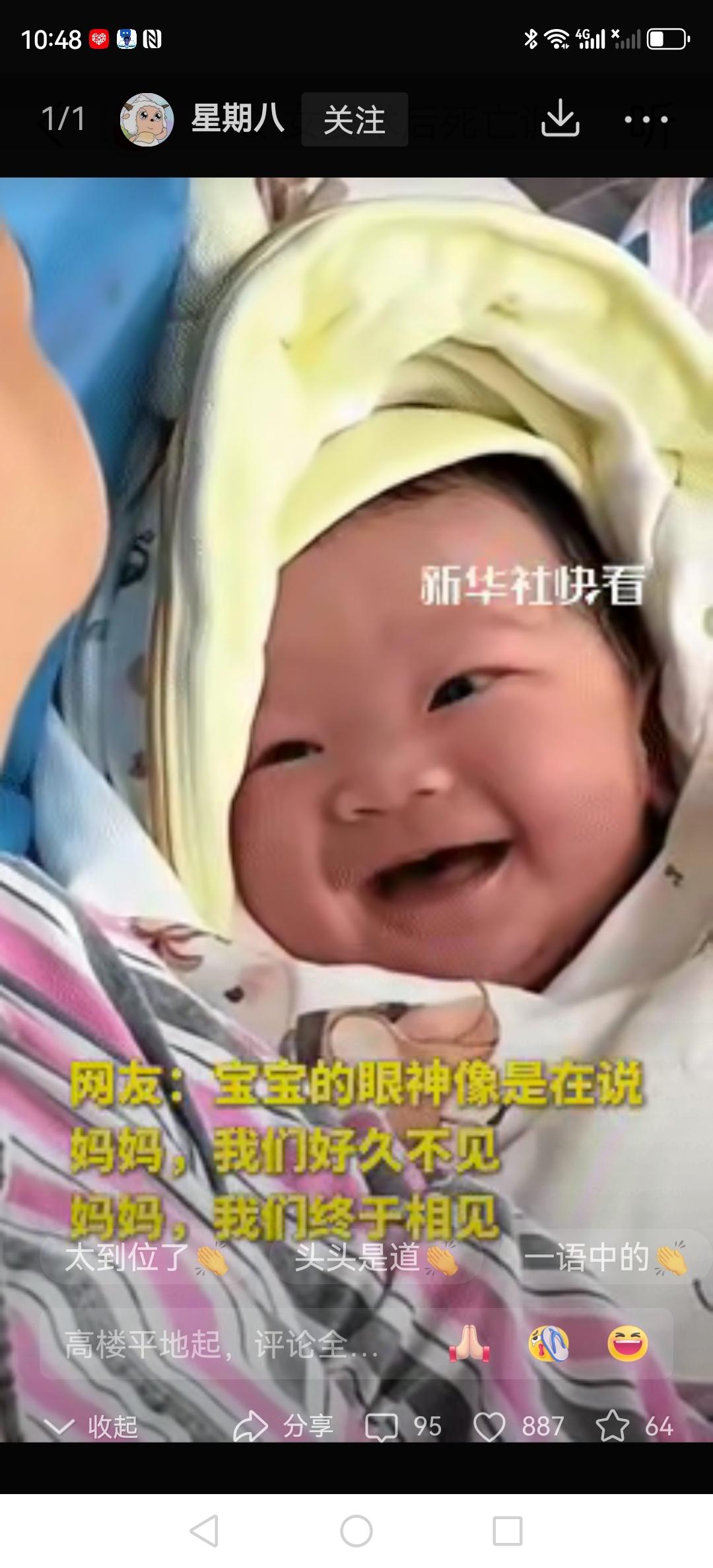 刚从手术室出来的妈妈脸色还有点苍白,正虚弱地躺着休息。这时候家人把还在小声哭闹的宝宝抱到了她身边。奇妙的事情就这么发生了——原本还皱着小脸哼哼唧唧的小家伙,一碰到妈妈的床沿就像被按了暂停键,圆溜溜的眼睛一下子就直勾勾盯着妈妈的脸,看了几秒后,小嘴突然咧开,露出没长几颗牙的小笑容,甜得人心都化了。 视频里,妈妈看着身边这个皱巴巴的小婴儿,眼睛里的温柔藏都藏不住,嘴角不自觉地就扬了起来。没想到宝宝像是接收到了妈妈的信号,小脑袋跟着轻轻点了点,也咯咯地笑出声,那模样可爱得让人想一直盯着看。这一幕刚好被守在旁边的家人用手机录了下来,传到网上后,好多网友看完都红了眼眶,纷纷在评论区留言。 评论区里,有人说:“这大概就是母子之间天生的连接吧!”也有网友在评论里打趣:“宝宝这是在说‘选对妈妈啦’吧!”还有人看到这一幕,眼眶一下子就热了,说:“突然想起我第一次抱自家娃的时候,心都化了,原来宝宝和妈妈之间的感应真的这么神奇。” 其实呀,刚来到这个世界的小生命,好像天生就对妈妈的声音和味道特别熟悉。当宝宝躺在妈妈身边的时候,一下子就安静下来,像是找到了最舒服的小窝,浑身都放松了。而妈妈的那个笑容啊,对宝宝来说就是最甜的礼物了,能让他觉得这个世界都暖暖的。 这样的小瞬间,是不是也让你想起了自己当爸妈的第一刻?你家娃有没有过让你瞬间心软的小表情呀? -search.byteimg.com/img/labis/86b12774cfb598d258b9cb2fd99fcfc0~480x480.JPEG病床上的宝宝 刚出月子的妈妈 手术室内 刚出院的妈妈 手术室瞬间 产科手术室 手术室里的妈妈