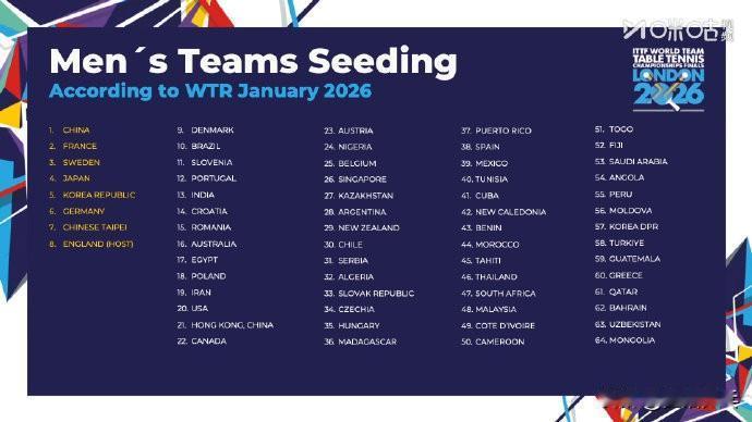 🏓️北京时间1月26日,伦敦世乒赛团体赛抽签仪式举行,国乒男团作为1号种子,将参加小组赛A阶段的比赛,比赛结果将决定淘汰赛阶段的种子队排位。 伦敦世乒赛团体赛抽签仪式 2026.1.26