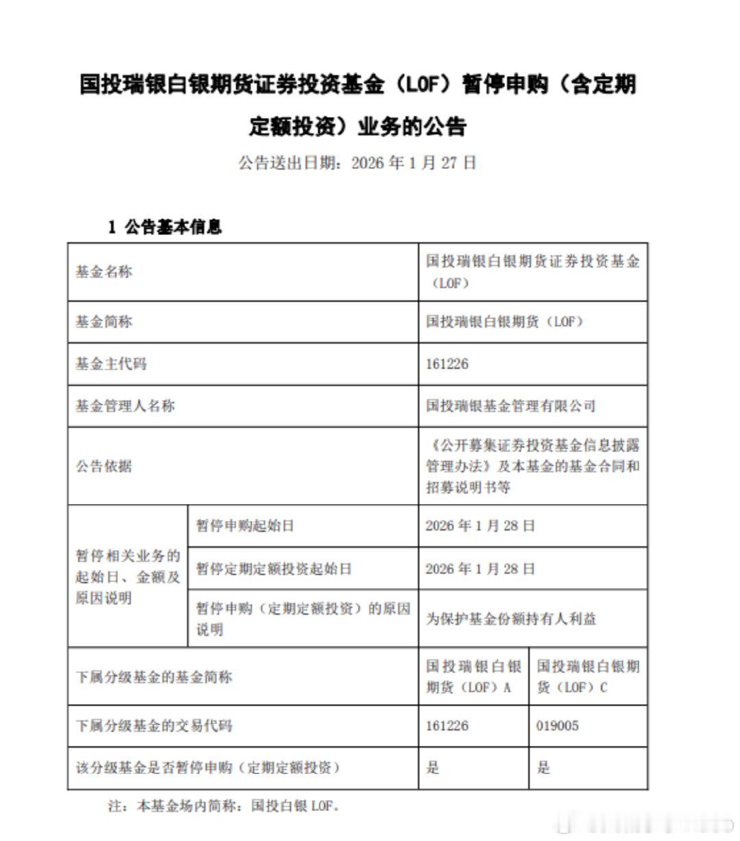 【国投白银LOF将暂停申购】财联社1月26日电,国投白银LOF公告,将于1月28日起暂停申购(含定期定额投资)业务。