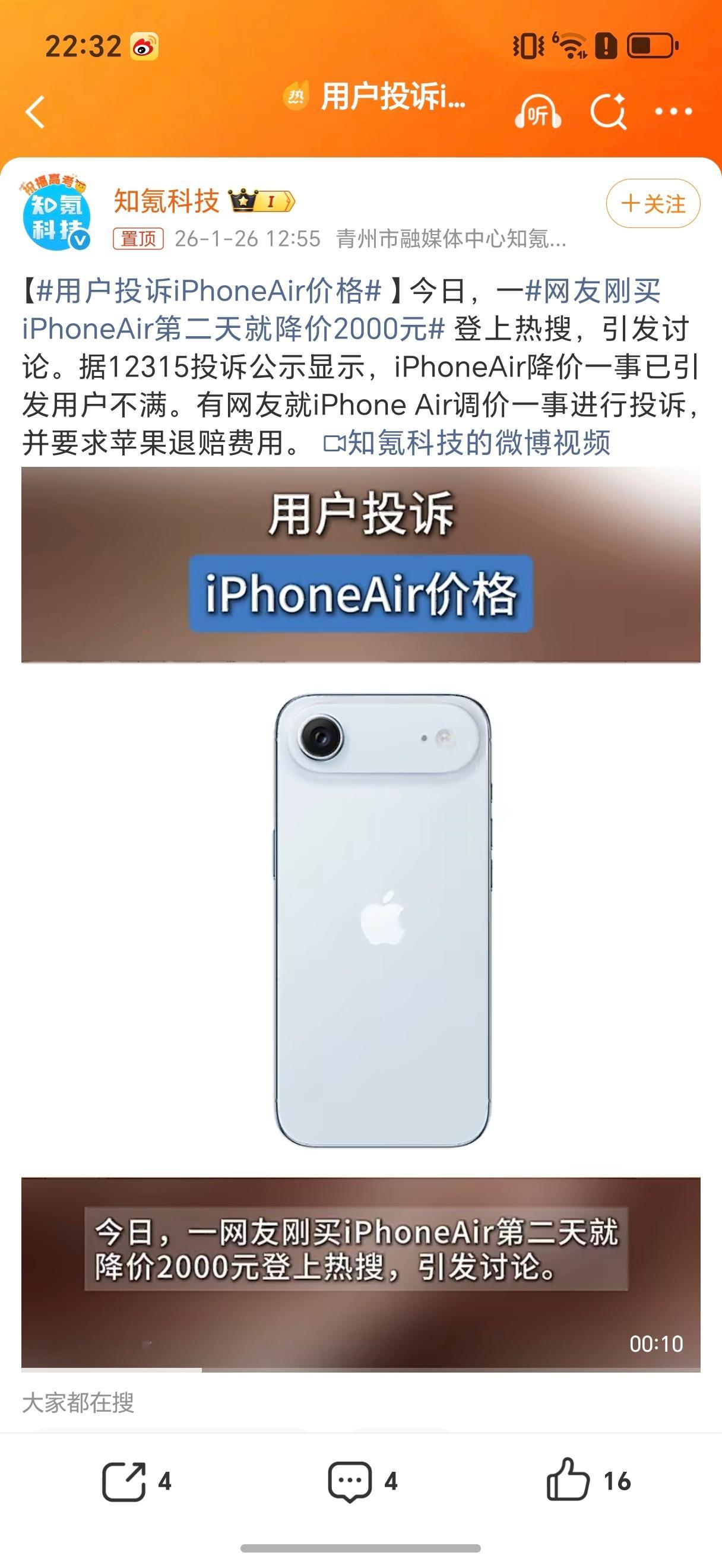 用户投诉iPhoneAir价格 额,我感觉可以理解。如果这事发生在我自己身上,也会觉着挺恼火的。只是投诉12315未必有效,等一个后续。
