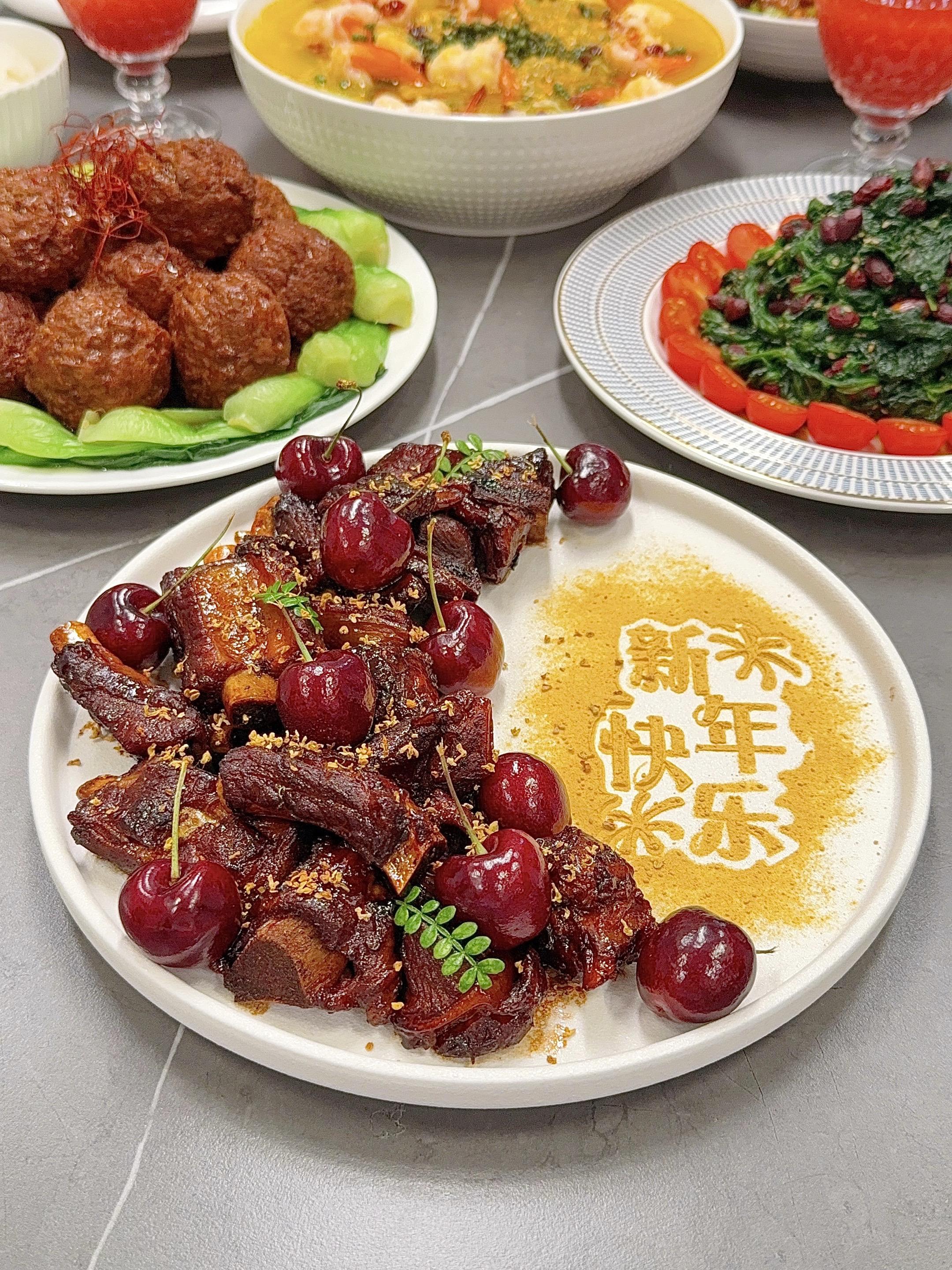 都说年夜饭是年度厨艺大考,但本90后厨房“邪修派”代表,今年决定抛开传统套路,用点巧思和神器,让一桌菜既有年味,又有新意。 🧧新年家宴菜单分享: ❶【樱桃小排】 ❷【百香果酸汤虾片】 ❸【莲藕狮子头】 ❹【果仁菠菜】 ❺【辣子鸡丁】 ❻【蓝莓山药】 ❼【白灼西兰花】 🍓水果:草莓&红提