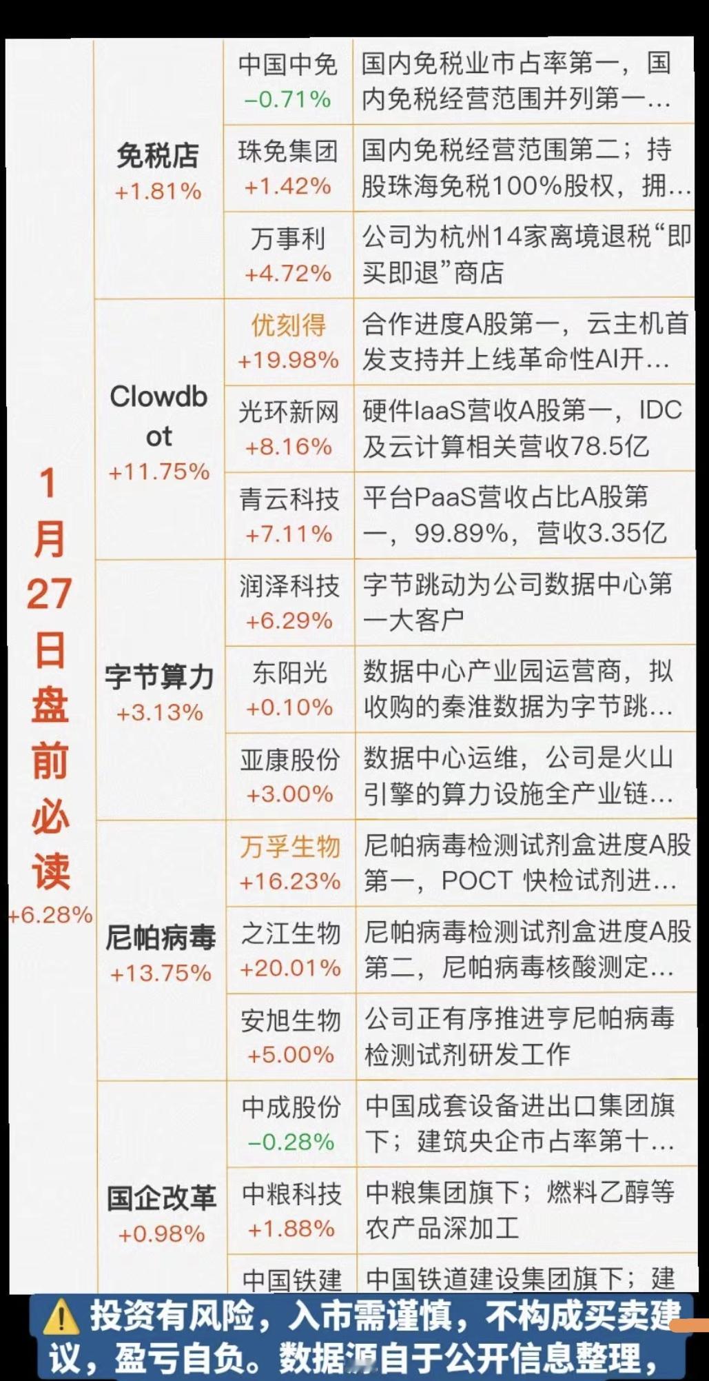 1.27周二 盘前 财经热点必读! 1.免税店,消费零售 2.Clawdbot AI智能体 3.字节算力,AI应用 4.尼帕病毒防治 5.国企改革