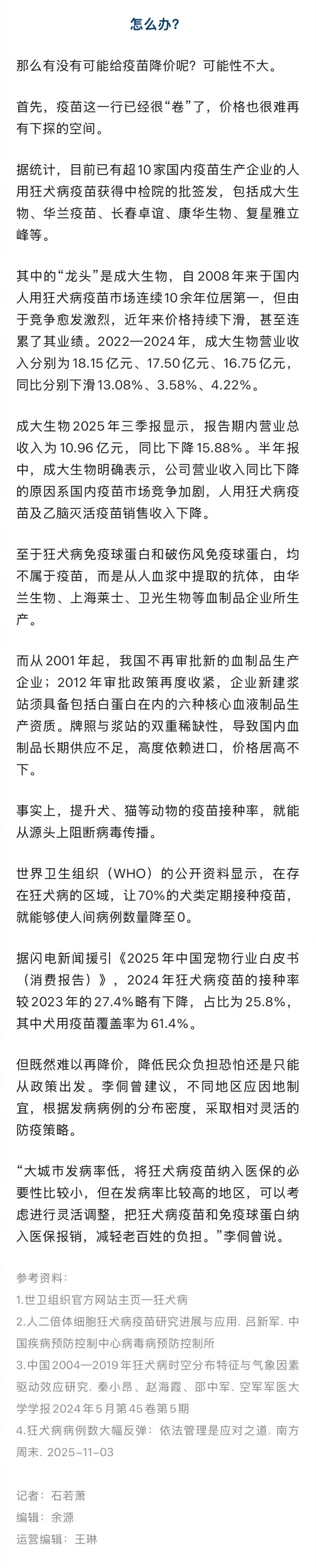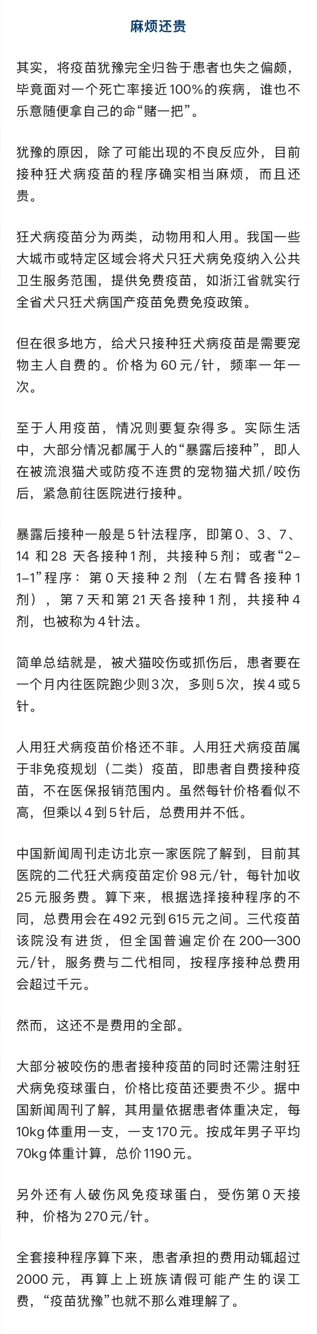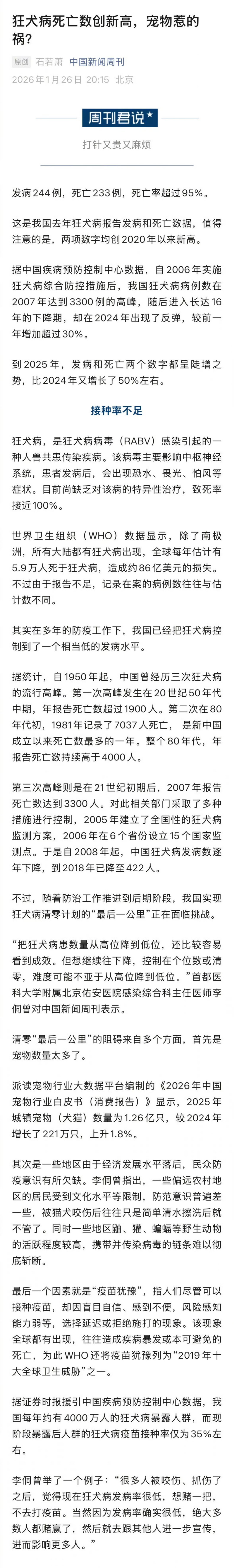 【#专家建议狂犬病高发区将疫苗纳入医保#】发病244例,死亡233例,死亡率超过95%。这是我国去年狂犬病报告发病和死亡数据,值得注意的是,两项数字均创2020年以来新高。据中国疾病预防控制中心数据,自2006年实施狂犬病综合防控措施后,我国狂犬病病例数在2007年达到3300例的高峰,随后进入长达16年的下降期,却在2024年出现了反弹,较前一年增加超过30%。到2025年,发病和死亡两个数字都呈陡增之势,比2024年又增长了50%左右。狂犬病,是狂犬病病毒(RABV)感染引起的一种人兽共患传染疾病。该病毒主要影响中枢神经系统,患者发病后,会出现恐水、畏光、怕风等症状。目前尚缺乏对该病的特异性治疗,致死率接近100%。据证券时报援引中国疾病预防控制中心数据,我国每年约有4000万人的狂犬病暴露人群,而现阶段暴露后人群的狂犬病疫苗接种率仅为35%左右。(中国新闻周刊) #我国狂犬病死亡数创2020年来新高#