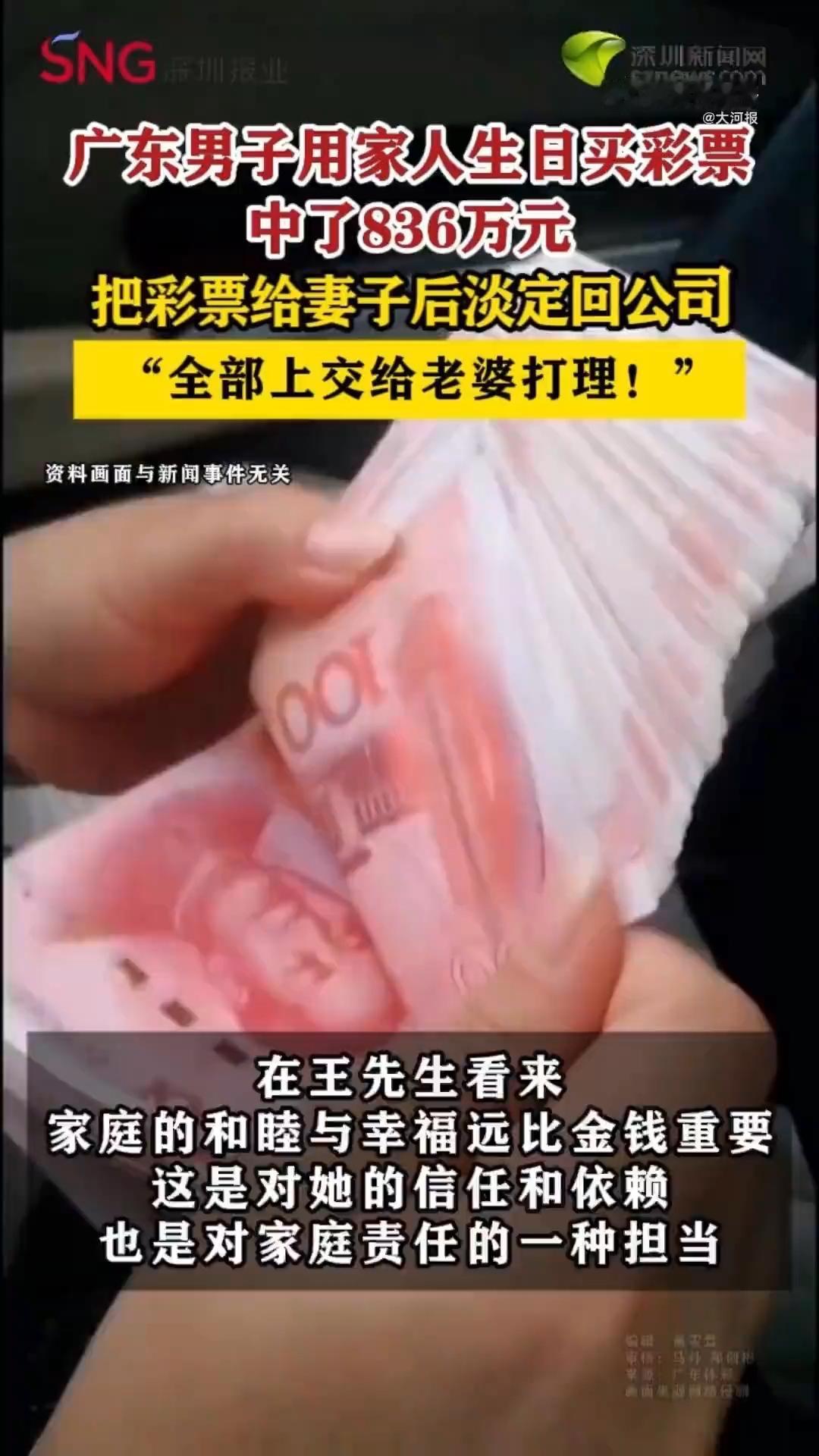 中836万全交老婆,转身淡定上夜班:这才是成年人最顶级的清醒 “如果中了800万,你第一反应是什么?”辞职环游世界?疯狂购物报复性消费?还是瞒着家人偷偷藏私房钱?广东佛山王先生的答案,让全网沉默又敬佩——把836万彩票塞给老婆,转身赶去公司上夜班。 1月26日,体彩官方通报的喜讯刷屏全网。王先生在交班间隙吃晚饭时,随手核对彩票号码,越对心越慌,确认中了一等奖的瞬间,心跳直接飙到顶点。但他没狂喜尖叫,反而第一时间拨通妻子电话,匆匆赶回家把彩票交到妻子手里只说了句“收好,我下班再商量”,就踩着点返回公司值守夜班。 妻子捧着彩票反复核对,激动得一夜无眠,他却在岗位上照常履职;税后668.8万巨款到手,他毫不犹豫宣布“全交给老婆打理”,自己依然按时打卡上班。这份淡定不是装出来的——从2013年起他每期都坚持购彩,却始终抱着“不中奖就当支持公益”的心态,每月花费不超百元,中奖号码还是用家人生日组合的,藏着对家人的牵挂。 对比那些中大奖后就飘了的人,王先生的清醒太珍贵:有人挥霍无度五年就返贫,有人辞工享乐坐吃山空,还有人因奖金分配和家人反目成仇。而他明白,工作不是为了赚钱糊口,更是生活的“压舱石”;金钱能改善日子,却换不来家庭和睦。把奖金全交妻子,是信任更是担当——婚内中奖本就是夫妻共同财产,这份坦荡比巨款更戳人。 网友的评论说出了所有人的心声:“这才是真男人,富贵不能淫”“最好的爱情,就是中大奖第一时间想到你”“他交给老婆的不是彩票,是心安和底气”。其实我们羡慕的从来不是800万,而是面对横财时的理性,是夫妻间毫无保留的信任,是不被金钱裹挟的清醒。 生活里,太多人把“暴富”当终极梦想,却忘了真正的幸福从来不是天降横财。王先生用行动告诉我们:成年人最顶级的智慧,是好运降临不迷失,财富在手不膨胀。守住对家庭的责任,守住对生活的节奏,这份通透,远比任何奖金都更能滋养人生。 如果是你中了800万,会第一时间告诉谁?又会做出怎样的选择?欢迎在评论区聊聊你的真实想法!
