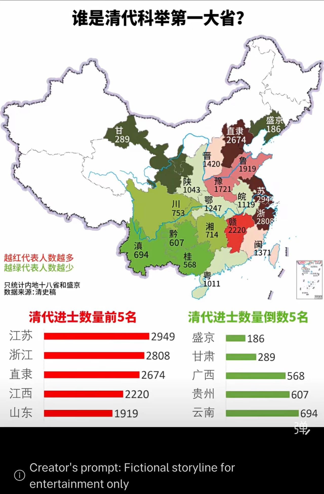 权威数据所示,清代科举第一大省为江苏,进士数量达2949人,浙江以2808人紧随其后,两省稳居榜首,形成明显的“江南文化高地”。这与当地经济繁荣、书院林立、文化积淀深厚密切相关。倒数五名中,盛京(今辽宁)仅186人,甘肃289人,反映出边疆及偏远地区教育基础相对薄弱,与核心文化区存在显著差距。若对比当下,变化最大的可能是盛京及周边地区——随着近代以来东北开发、教育普及及工业发展,该区域的文化教育水平已大幅提升,与清代边缘地位形成鲜明对比。而江浙地区凭借历史积累,至今仍保持文化教育领先优势,体现了历史延续性。整体上,科举格局映射出清代教育资源高度集中于江南的态势。