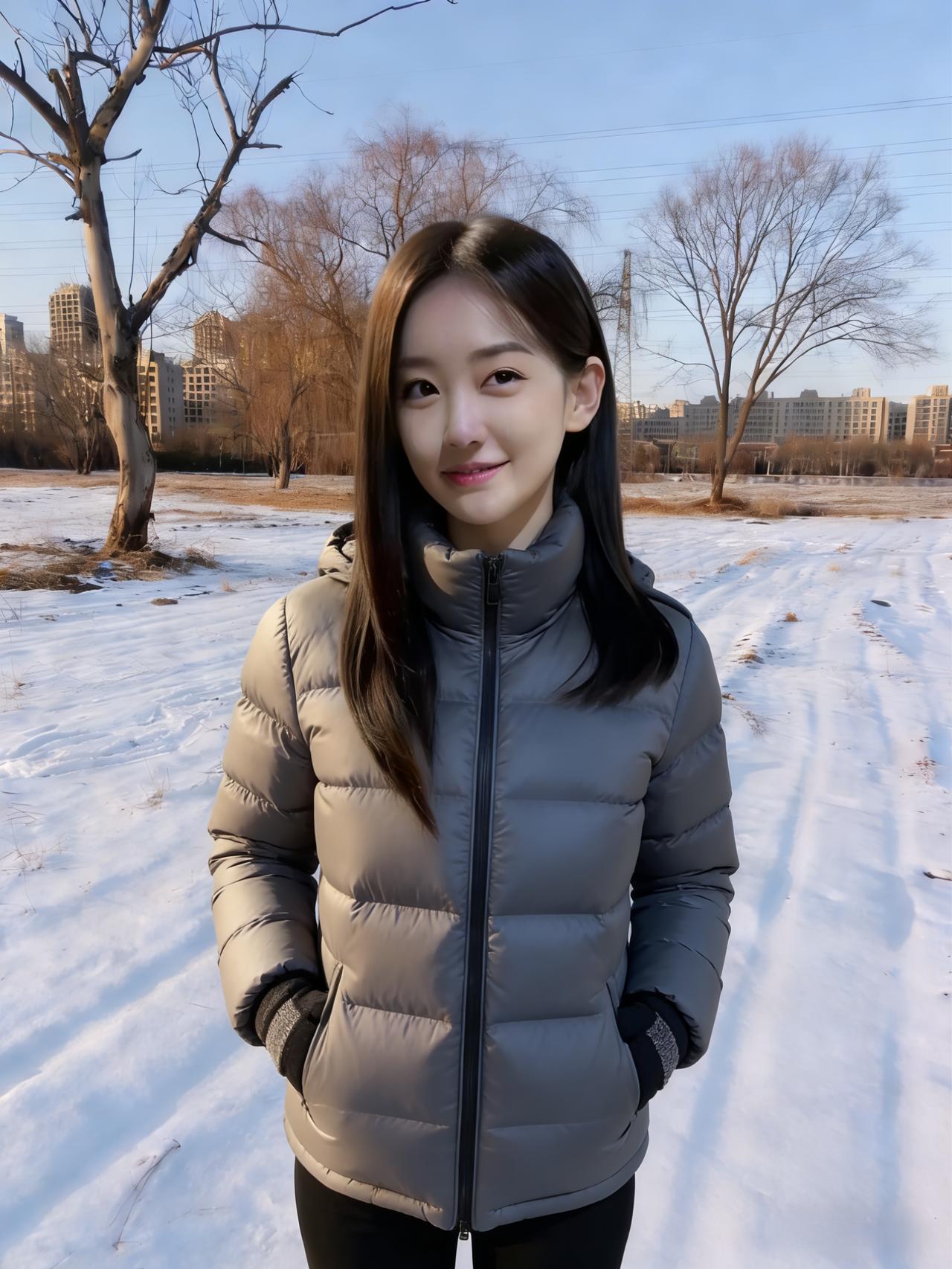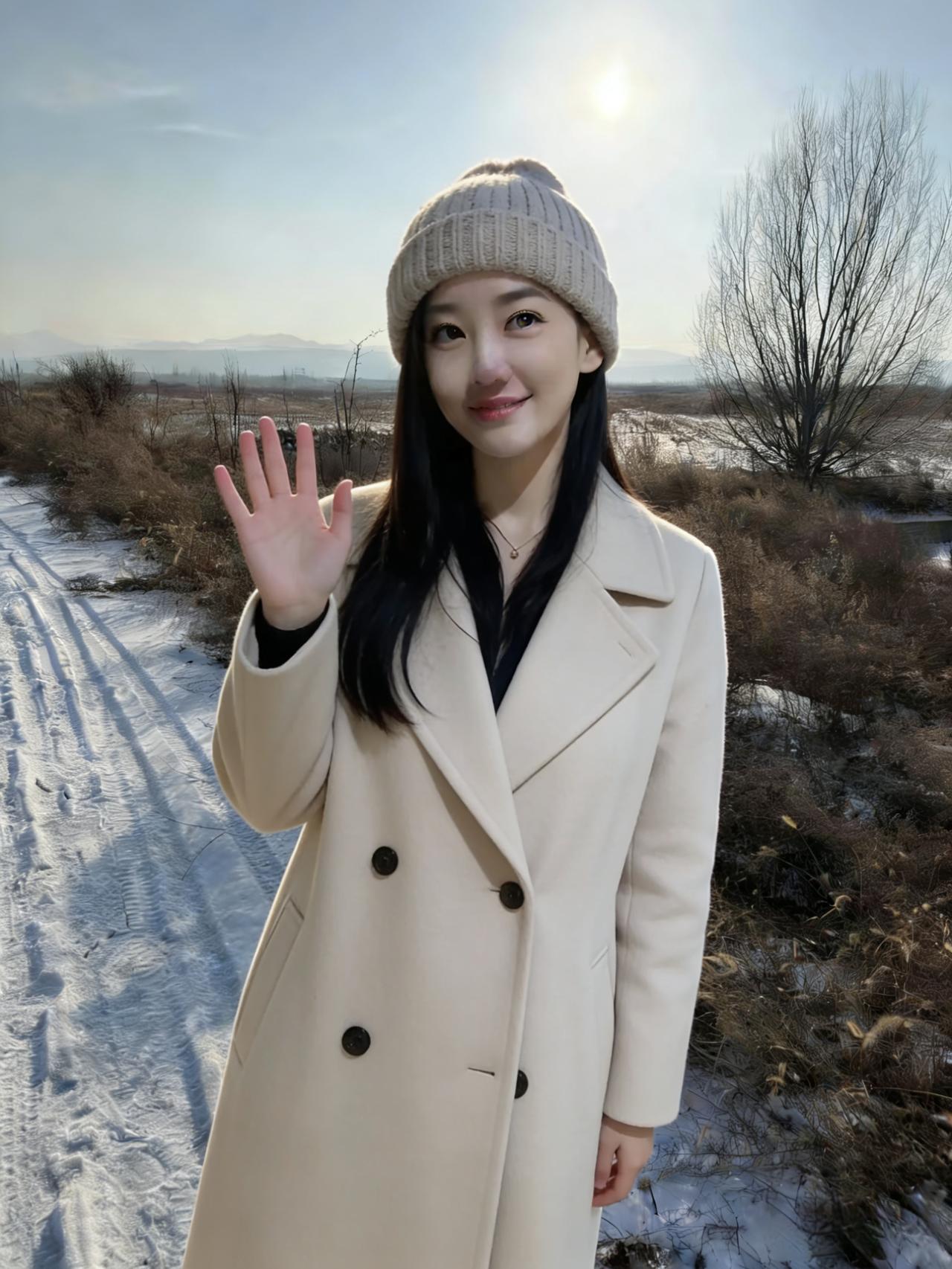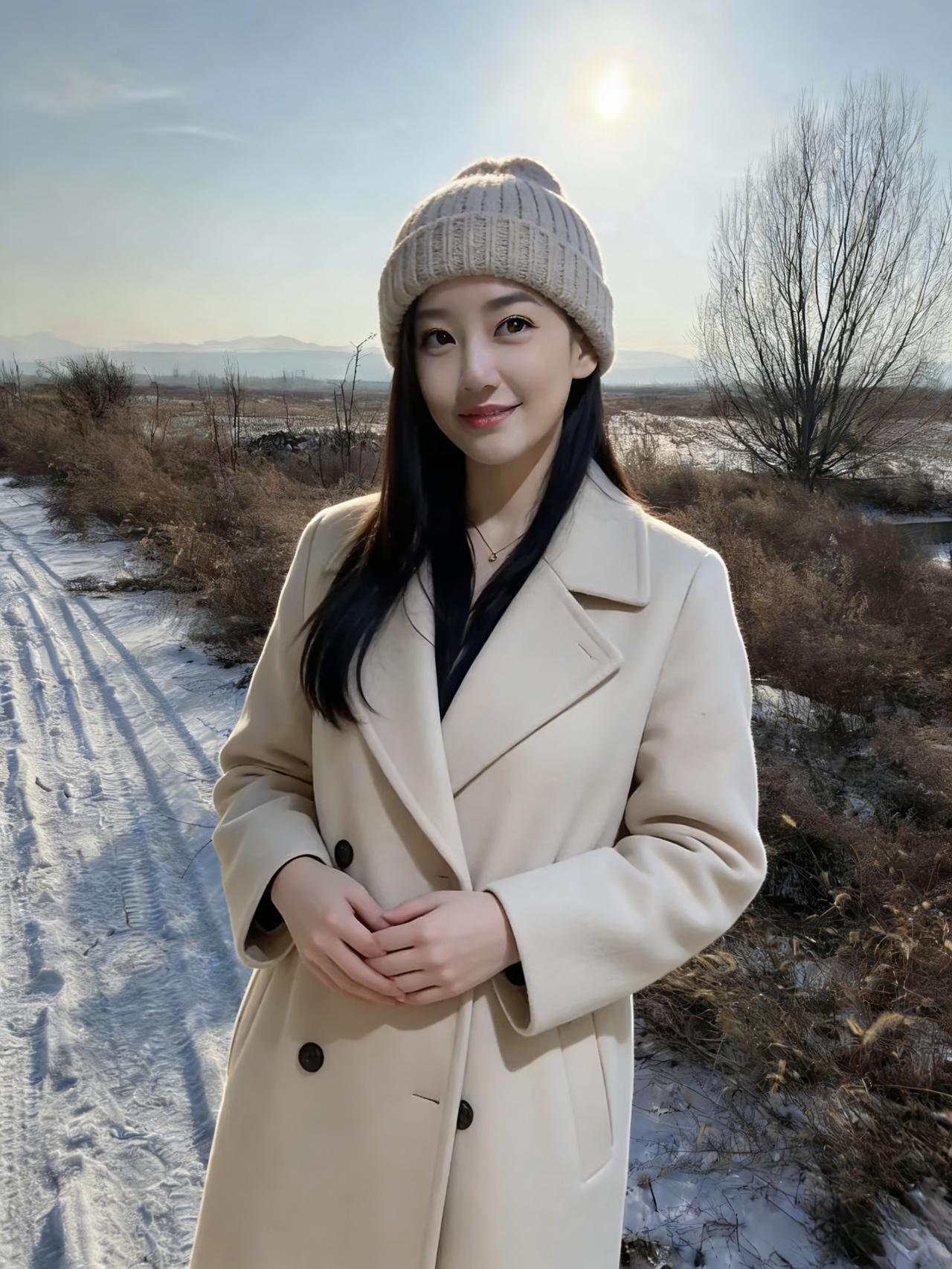 雪粒在睫毛上融化成星子 风穿过大衣绒毛,像旧年的歌 你仰起脸时,阳光撞碎在笑涡里 围巾垂落的弧度,接住了半冬的温柔 ~ 电线杆沉默地丈量天空 枯树把影子织成细密的网 我们站在白与褐的交界 呼吸是云,脚步是雪上的诗行 ~ 每一次抬眼都有飞鸟掠过 每一缕发丝都缠着旷野的风 这不是定格的帧,是日子在发光 是冷冽里藏着的、发烫的心跳 ~ 当你转身,脚印便长出了翅膀 要把此刻的暖,驮向春天的方向