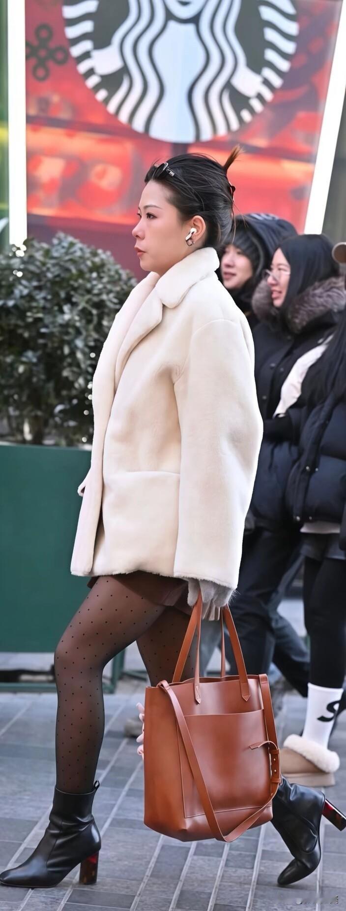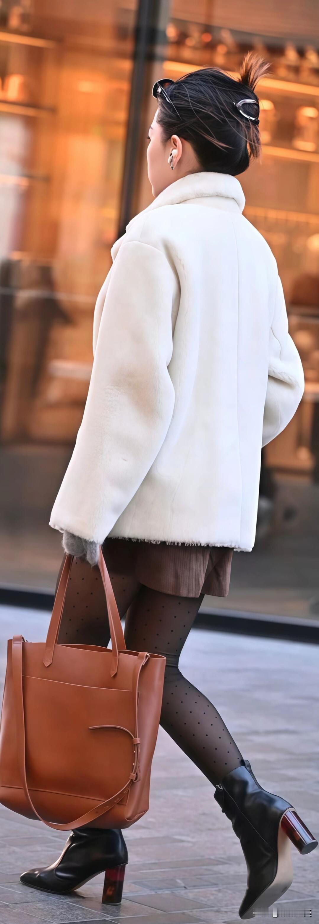 冬日街头氛围感拉满!米白毛绒大衣配短靴,自带温暖滤镜,拎着大包大步走,保暖和时髦我都要。