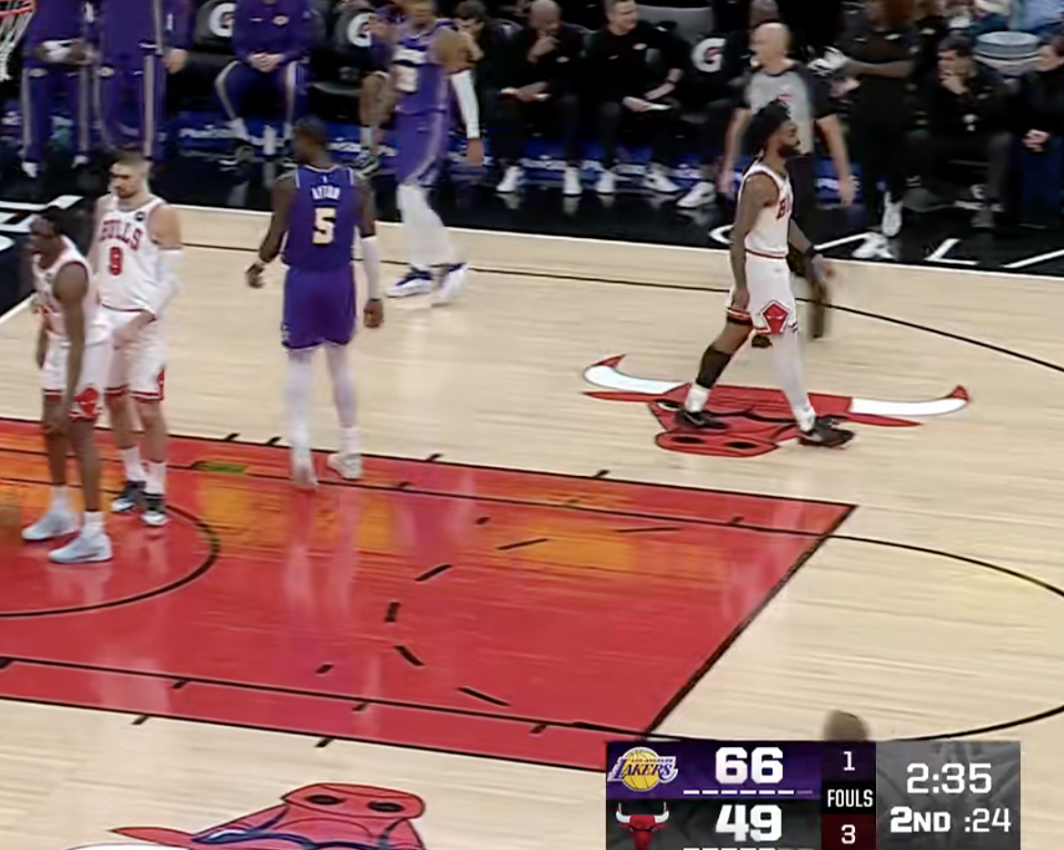 暂停!湖人66-49公牛,打得不错,第二节还有2分35秒!湖人vs公牛