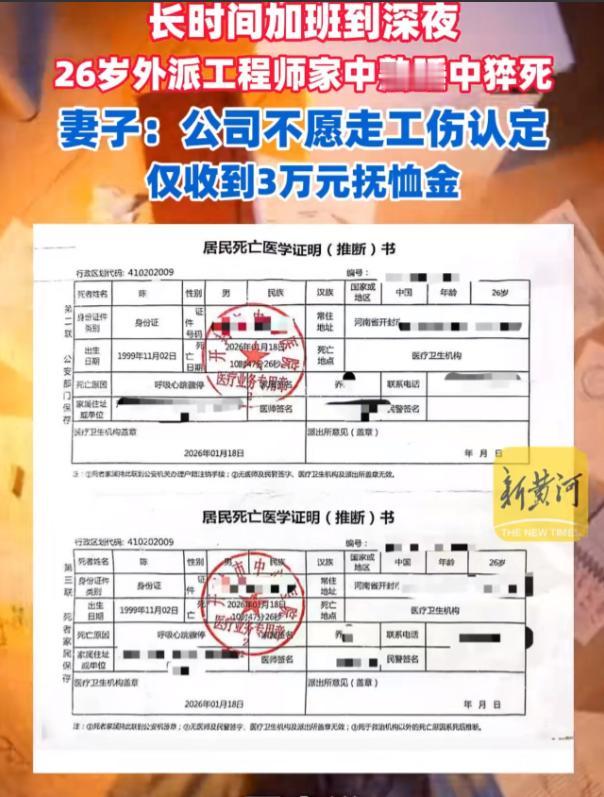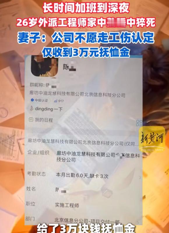 “牛马不如!”河南开封,26岁男子在睡梦中猝死,妻子认为丈夫死的蹊跷,怀疑是在公司经常加班经常加班到深夜,疲劳过度导致的。气愤之下,要求认定为工伤,公司承担责任,没想到,公司只给了30000元抚恤金就没下文了。妻子委屈的说:我还有50多万房贷没还呢! 26岁的陈先生骤然离世,给妻子乔女士留下的,除了十年相守的记忆,还有一副压得人喘不过气的重担。 这套2024年才装修好入住的房子,曾装满两人对未来的憧憬,如今却只剩五十多万的房贷悬在头顶,成了乔女士独自面对的难题。 陈先生生前从事实施工程师工作,通过劳务派遣的方式入职,工作地点一直不固定,常年在外奔波。 2025年8月正式入职后,他先被分派到北京分公司履职,没稳定多久,就又被调往湖北襄阳的项目部,负责审计实操相关工作,与家人聚少离多。 入职前的体检报告上,陈先生的各项身体指标均显示正常,没人能预料到,仅仅半年的高强度工作,就彻底拖垮了这个年轻的身体。 他的工作压根没有准点下班的概念,工作日里,深夜十一二点还在工作群里对接工作是常事,最极端的一次,忙到凌晨一点多才算卸下手头的活儿。 好不容易等到周末,能回到开封的家里歇一歇,工作也依旧如影随形。 手机必须24小时开机,工作电话、线上对接消息不停涌入,笔记本电脑更是贴身携带,随时待命。 有一次回老家探亲,忘了带工作电脑,为了不耽误审计底稿的处理进度,他专门跑到家附近的网吧,登录工作系统赶工,半点不敢马虎。 就连手机偶然没电关机,都会被领导发来微信质问,这份无时无刻的压迫感,让他常常在夜里跟乔女士吐槽,满是疲惫与无奈。 即便如此劳累,但他每个月的工资并不多,加上绩效和各项补贴也不过七千元,加上房贷的压力,他连松懈的资格都没有。 2025年1月18日的周末,陈先生总算不用奔波出差,但就是天刚蒙蒙亮时,正在熟睡的陈先生突然发出一声惊叫,紧接着便失去了意识。 乔女士拨通了120急救电话后,救护车火速将他送往医院,但最终还是没能挽回这条年轻的生命,官方确诊死因为呼吸心搏骤停。 接诊医生了解到他长期熬夜加班、精神始终高度紧绷的工作状态后,明确判断猝死与过度劳累、压力长期累积直接相关,这一结论也被清晰标注在死亡证明上。 事发后的第二天,公司派人送来三万元抚恤金,放下钱后便再无音讯,既没有对家属进行情绪安抚,也没有提及后续的处理方案。 乔女士坚定地认为,丈夫的离世完全是长期超负荷工作导致的,理应被认定为工伤,但公司却明确拒绝了这一合理诉求,只愿意用三万元草草了事。 走投无路之下,乔女士在1月22日晚间,将丈夫生前的加班记录、工作聊天截图发布到社交平台,希望借助舆论力量寻求帮助,帖子很快就引发了网友的广泛关注。 公司得知此事后,迅速联系乔女士,要求她立即删除帖子,还口头承诺会就此事进一步协商处理。 为了能顺利推进沟通,乔女士只好无奈地将帖子隐藏。 可帖子一旦隐藏,公司的态度就立刻发生了转变,之前许下的承诺全部不算数,再次陷入推诿扯皮的局面,对工伤认定一事始终不愿正面回应。 记者后续尝试联系陈先生所在的公司,接线人员只用“不清楚情况”一句敷衍,便匆匆挂断了电话,没有给出任何实质性的回应。 从法律角度来看,陈先生的情况其实完全符合视同工伤的认定标准。 公司以“非工作地点、非工作时间”为由拒绝认定工伤,本质上就是在逃避自身应尽的用工责任,三万元抚恤金更是杯水车薪,根本弥补不了一个家庭失去顶梁柱的伤痛。 陈先生的悲剧,戳中了无数职场人的痛点,藏着太多普通人打拼的无奈与心酸。 劳累猝死从来都不是毫无预兆的意外,而是长期透支身体的必然结果,这一深刻教训,值得所有企业和劳动者警醒。 企业不能将员工当作可随意消耗的工具,一味追求效益而忽视员工的身心健康;劳动者也要守住身体的底线,别为了生计轻易用健康去换取薪水。 只愿这样的悲剧能不再重演,每一份辛勤付出都能被尊重,每一个鲜活的生命都能被温柔善待。