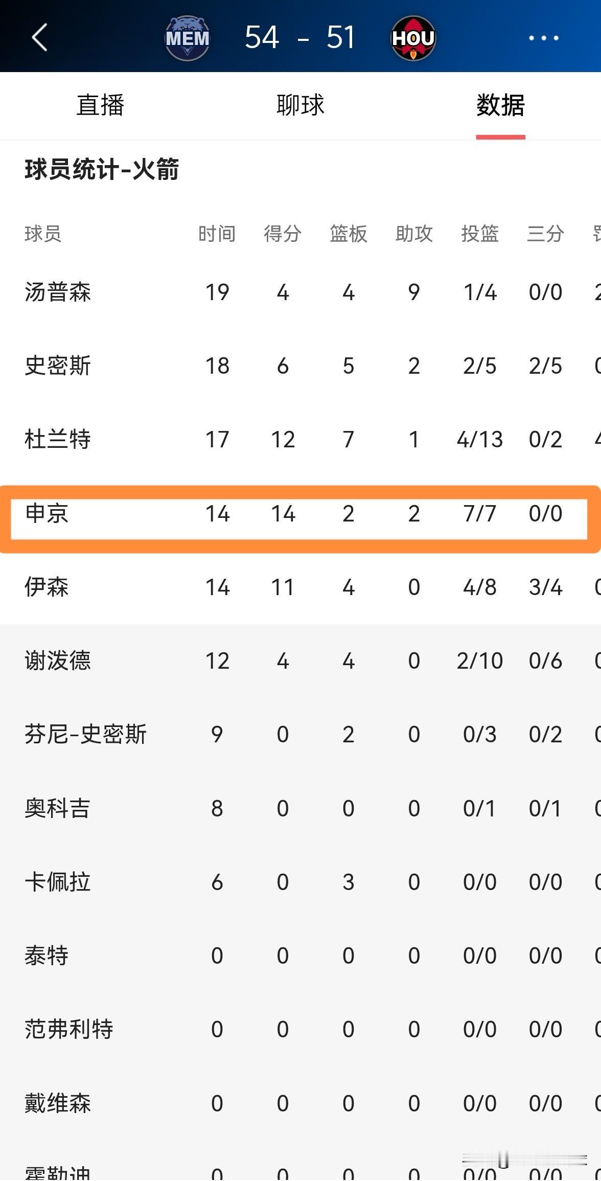 火箭当家中锋申京真是弹无虚发!在今天火箭主场迎战灰熊的比赛中,目前双方半场战罢,虽然火箭以51:54落后于对手,但是申京的表现堪称惊艳。 在前两节比赛中,申京首发出战14分钟,投篮7中7极其高效的砍下14分,还有2篮板2助攻1抢断,他的场上正负值为全队最高的+6。 无论如何,申京在上半场比赛中的进攻表现是无可挑剔的。