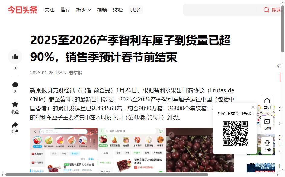65.5万吨智利车厘子运往中国,好像这车厘子专为中国人种植的,为什么智利当地人不吃?是吃不起吗?今年车厘子价格大跳水,便宜的很。 智利的车厘子产业早就绑上了中国市场,近十年对华出口量涨了快20倍,现在中国占了他们车厘子出口量的91%,剩下的才分给其他国家。 对智利果农来说,最好的果子肯定要运到中国来。咱们市场认品相、认大小,越大越甜的卖价越高,他们自然愿意把优质果卖给我们换外汇。 当地超市里也有车厘子,但大多是品相一般的,价格虽然比咱们以前买的便宜,可比当地常见的香蕉、苹果还是贵不少,普通家庭不会天天吃,顶多过节买一点尝尝。 而且智利人的饮食习惯里,车厘子本来就不是日常水果。他们本土水果多,香蕉、橙子、葡萄这些又便宜又好买,车厘子在当地更多是节日水果,或者用来做甜点、果汁,不像我们这样直接当鲜果果盘主力。人家也有专属吃法,比如拌酸奶、煮白兰地,只是咱们没怎么见过而已。 可能有人会问,这么多车厘子从智利运到中国,漂洋过海两万多公里,为啥到咱们手里还能又脆又甜?这可不是靠防腐剂,全靠一套成熟的冷链技术。 采摘后4小时内就泡进0到1℃的冰水里,快速降温让果子进入休眠状态,装箱后再抽掉氧气充氮气,相当于让果子“假死”。 现在还有专门的“车厘子快线”,32艘专船跑专线,航程从以前的28天缩短到23天,到港后还能“船边直提”,上午到港下午就能入仓,当晚就上超市货架。咱们买回家拆开包装,果子接触氧气才“醒过来”,这也是为啥放两天就容易软,不是商家做了手脚。 再说说今年价格大跳水的事,核心就是供大于求,再加上成本降了。首先是产量暴增,今年智利气候好,车厘子产量比去年快翻了一倍,光运到中国的就比去年多不少,市场上货多了,价格自然压下来了。 其次是运输成本大降。以前车厘子多靠空运,运费贵得离谱,自然推高了售价。现在海运成了主流,专线快船加上物流优化,单柜运输成本降了10%到20%,比空运便宜60%以上。再加上2017年中智自贸协定升级,车厘子进口零关税,这又省了一大笔钱。 还有电商平台的功劳,现在都搞产地直采,砍掉了中间层层批发商,价格直接给到消费者。北京新发地的数据显示,去年12月海运车厘子均价还是47.5元一斤,今年1月就降到26.5元一斤,降幅快一半了。电商上2.5公斤装的3J车厘子,一百多块钱就能拿下,放在以前想都不敢想。 有人会说,咱们自己也有烟台大樱桃、汶川甜樱桃,为啥还靠进口?关键就是时间差。智利在南半球,他们的夏季正好是咱们的冬季,咱们这边樱桃树还在过冬,智利的车厘子刚好成熟,精准卡在春节这个消费旺季,这是天然的优势。 不过今年车厘子价格也不是一直跌,业内估计春节前可能会小幅反弹。因为目前九成以上的货都已经到港了,后续到货量会减少,加上春节家家户户都要备果盘,需求上来了,价格大概率会涨一点。喜欢吃的可以趁现在价格低多囤点,放冰箱冷藏能存一阵子。 其实这65.5万吨车厘子背后,就是一场全球化的分工。智利人种果子赚外汇,咱们花实惠价格吃新鲜水果,物流和政策在中间搭了桥。以前觉得是奢侈品,现在变成家常果,不是果子变普通了,是整个产业链越来越成熟,成本降下来了,咱们的消费选择也更多了。