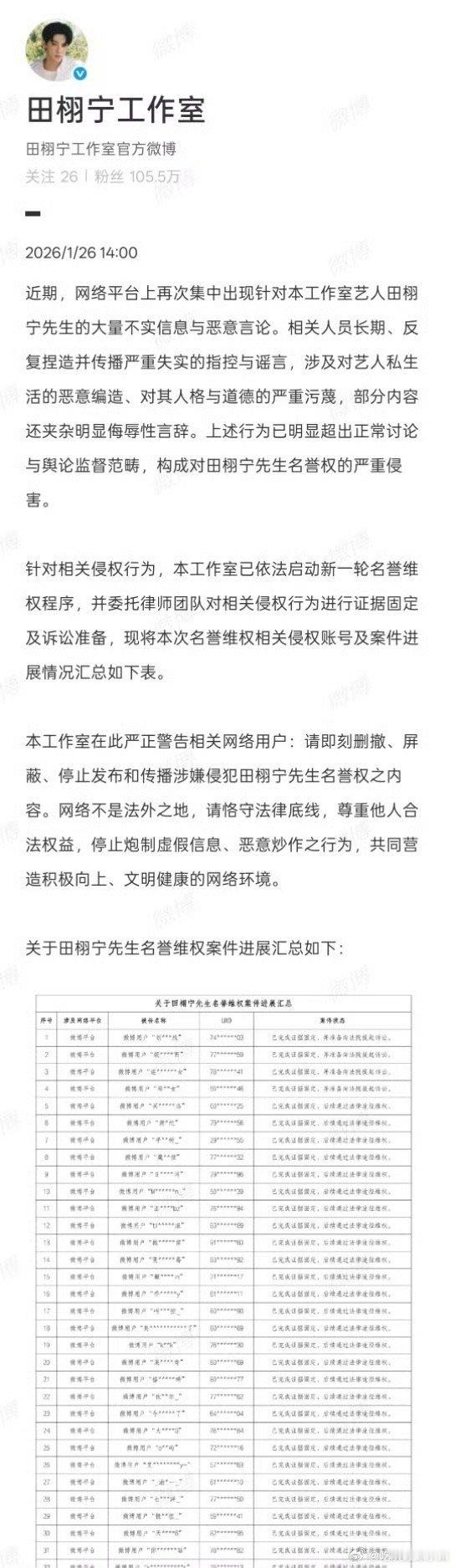 我去 这是怎么了 网友发现田栩宁工作室告黑名单里 有不少是梓渝的粉丝 这两家到底咋了田栩宁把梓渝粉丝告了田栩宁工作室发告黑进展