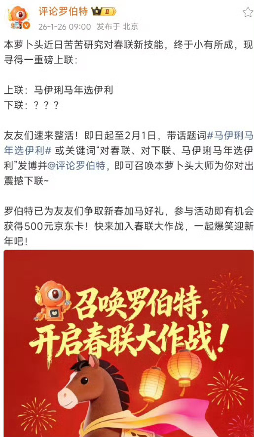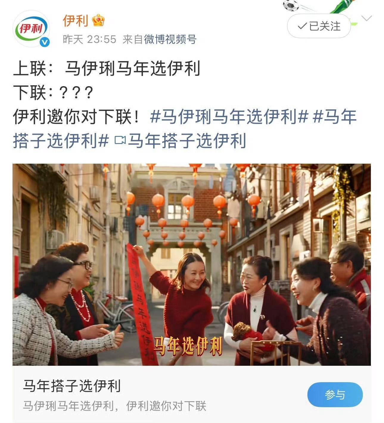 没想到马年对联还能这么整!伊利出了“马伊琍马年选伊利”的上联,罗伯特接梗超绝还对