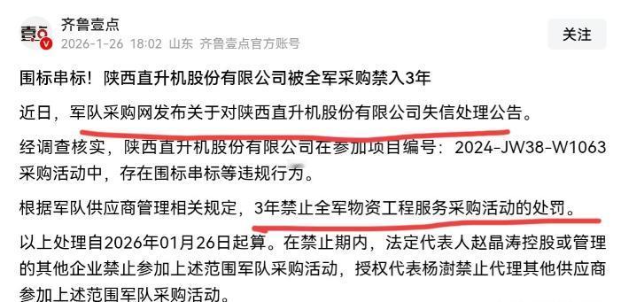 胆大包天!我们国家军队内部反腐打贪力度这么大,竟然还有人顶风作案,在军用装备采购方面搞围标串标! 1月26日,军队采购网一纸公告,把陕西直升机股份有限公司的违规行为公之于众,这家公司因为围标串标,直接被拉进了军队采购的黑名单。 信源——山东齐鲁壹点官方账号 -2026-1-26-18:02 ——围标串标!陕西直升机股份有限公司被全军采购禁入3年。 先把事儿说清楚,什么是围标串标? 说白了就是几家公司提前商量好,要么统一抬高报价,要么内定好中标方,其他公司陪着演戏凑数,最后把本该公平竞争的采购变成自家的生意。 这种行为在普通商业领域都明令禁止,放到军用采购里,更是性质恶劣到极点。 军队采购网的公告写得明白,陕直股份在参与编号2024-JW38-W1063的军方采购项目时,存在明确的围标串标行为。 处罚也一点不手软:从2026年1月26日开始执行,整整三年,禁止这家公司参与全军所有物资、工程、服务类采购活动。 不光公司受罚,法定代表人赵晶涛控股或管理的其他企业,也不能参加军队采购;授权代表杨澍更是被禁止代理任何供应商参与这类活动,等于彻底被排除在军队采购领域之外。 可能有人会说,是不是家小公司想投机取巧? 还真不是。 这家陕直股份背景不简单,是陕西省属国企,隶属于陕西投资集团旗下的航空产业发展集团,2017年就成立了,注册资本9个亿,实缴资金一分不少全到位。 2024年还是税务信用A级企业,顶着高新技术企业的头衔,甚至和国际知名的贝尔公司合作,搞起了贝尔407直升机在北美以外的独树一帜总装线,是陕西省重点扶持的通航企业。 就是这样一家有背景、有资质、受扶持的国企,不好好搞技术研发和合规经营,偏偏在军方采购里动歪脑筋 要知道,能参与军队采购项目,是对企业实力和信誉的极大认可,背后是国家和军队的信任。 可陕直股份却把这份信任当成谋利的工具,明知军队反腐力度空前,还敢以身试法,说白了就是心存侥幸,觉得能蒙混过关。 这可不是军队第一次对采购腐败下狠手。 去年8月底,火箭军后勤部就掀起过一场反腐风暴,5天之内连发180条公告,直接拉黑了74名评标专家和116家供应商。 这次反腐最狠的地方,是直接倒查9年,把2016年以来的所有采购项目挨个翻查,不管是已经退休的专家,还是背景雄厚的央企,只要有问题,一个都跑不掉。 被处理的74名专家,本该是替军队把关的“看门人”,结果却被利益收买,故意调高技术参数帮关系户中标,哪怕差零点几的数值,都能让军费多花几千万。 还有些专家干脆当起掮客,在供应商和采购方之间牵线搭桥,收巨额好处费。 这些人的下场就是终身禁入军队采购领域,名下公司也一并封杀,哪怕时隔九年,照样要为当年的猫腻买单。 被拉黑的116家供应商里,不乏参与过国家重大工程的央企。 有家通讯巨头,拿过“八横八纵”光缆网络、南极科考通信保障的项目,却在火箭军采购里搞围标,和关联公司商量好谁抬价、谁弃标,硬生生把市场价炒高。 军队采购不是普通生意,每一分钱都是纳税人的血汗钱,最终都要变成保家卫国的装备和物资,关系到部队战斗力,关系到国家安全。 围标串标看似是商业违规,本质上是在侵蚀国防根基。花高价买的可能是质量不达标的产品,一旦到了实战或训练中,出的就是人命关天的大事,绝不能容忍。 现在军队采购的监管早就不是过去的水平了,全流程信息化留痕,标书、评审记录、资金流向都一目了然。 验收环节还要全程录音录像,双录核验,负责人签字前必须逐项核对性能指标,只要和实战要求不符,立马停工追责。哪怕当年的负责人调离、退休,后台记录都能把责任落实到人。 更关键的是,军队黑名单实行全军共享,一处失信,处处受限。 有些企业想换法人、注册壳公司蒙混过关,可在资金流和核心人员的大数据对比下,很快就会现原形。 陕直股份这次被罚,不光自己三年不能参与军队采购,法人和授权代表的从业也受限制,等于彻底失去了这块市场,付出的代价远超一时的投机收益。 陕直股份的案例再一次说明,军队反腐没有死角,没有“过期日”,更不看企业背景。 不管你是省属国企还是行业巨头,不管是新账还是九年的老账,只要触碰了采购红线,就必然会被查处。军费绝不是谁都能啃的肥肉,军队采购领域也没有任何“后门”可走。 对所有想和军队合作的企业来说,这次事件就是个明确的警示:唯有诚信经营、合规竞争,才能站稳脚跟。 靠围标串标、投机取巧,或许能赚一时的快钱,但最终只会被彻底清除出市场,还要承担相应的法律责任。 军队的使命是保家卫国,采购环节的纯洁性直接关系到钢铁长城的稳固。 只有把每一笔军费都花在刀刃上,把不合格的企业和人员彻底挡在门外,才能让部队用上最靠谱的装备,让人民群众放心。 任何敢在军用采购里动歪心思的人,都注定会付出惨痛代价。