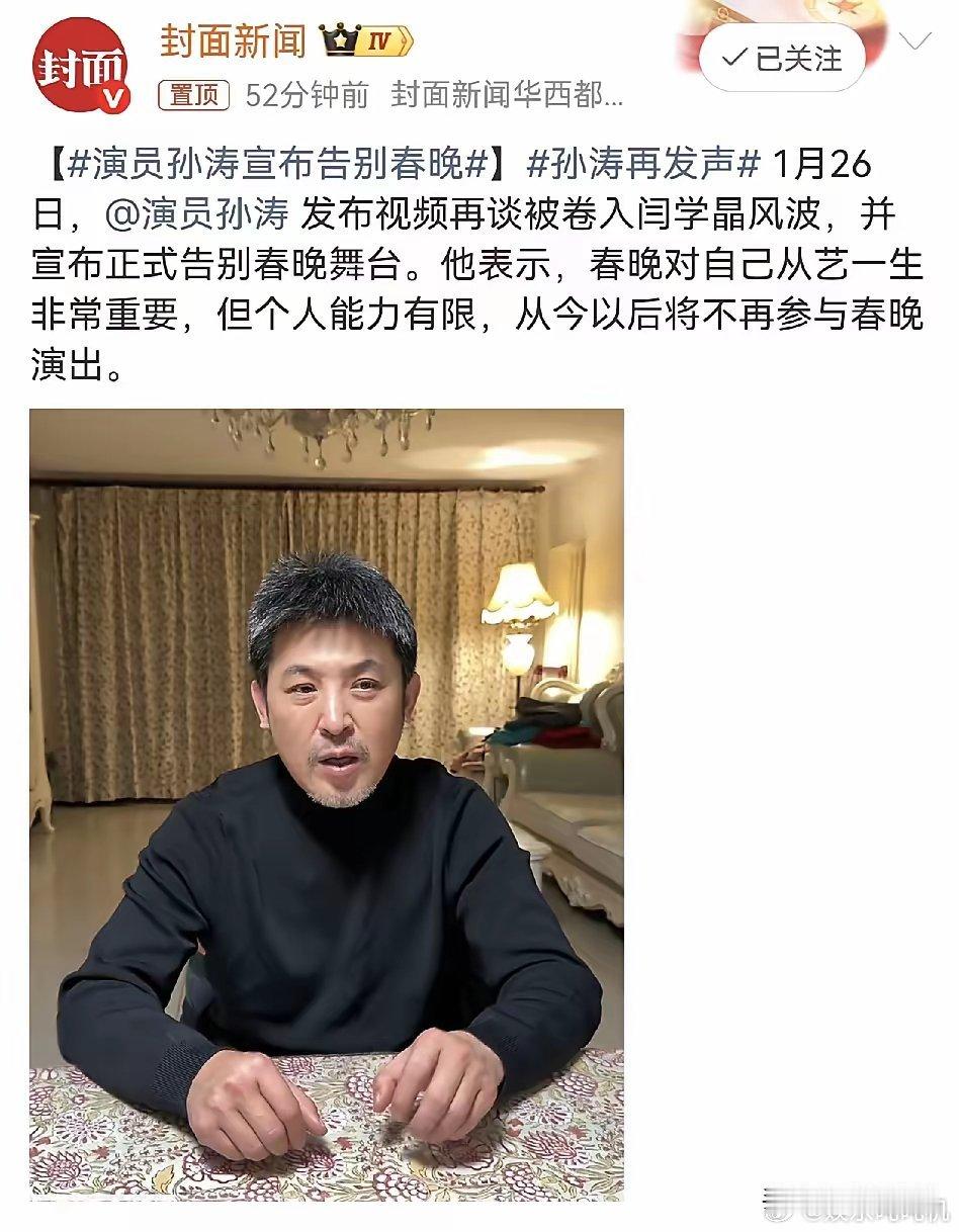 小品演员孙涛,官宣了!孙涛终于洗清“闫学晶事件”的冤屈,26日,孙涛再次宣布一件让人十分遗憾的事情,他正式退出春晚舞台。除此以外,他还首度细说被卷入闫学晶风波的委屈,字字戳心。作为登春晚18次的常客,孙涛的名字早和春晚绑定,2009年一句“我骄傲”更是火遍大江南北,成为几代人的春晚记忆 。可谁能想到,近期他因曾与闫学晶合作,就被营销号疯狂造谣,20天内遭8000多条造谣视频围攻,连妻子都被恶意抹黑,逼得他含泪发声“别侮辱我太太”。更难得的是,他多年来零带货、无公司,连直播打赏都关闭,却被造谣“卖杂粮心虚下播”,实在令人心疼。孙涛坦言春晚是自己从艺生涯的重中之重,但如今“个人能力有限”,选择彻底告别。要知道他早有让贤之心,曾连续4年主动放弃春晚机会,只想把舞台留给年轻人。从1995年首登春晚的青涩,到后来《你摊上事儿了》《上热搜了》等经典小品,他用接地气的表演温暖了无数家庭。没有炒作、没有黑料,只靠作品说话的老戏骨,最终因谣言选择离场,实在让人惋惜。但这份体面与坚守,早已让他成为观众心中永远的“春晚骄傲”!