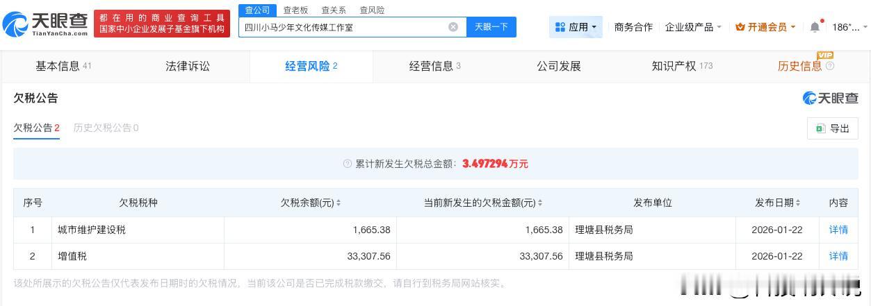 【丁真名下工作室因欠税被公告 丁真名下工作室欠税3.4万被公告】 天眼查天眼风险信息显示,近日,四川小马少年文化传媒工作室新增2则欠税公告,欠税余额合计3.4万余元,欠税税种为城市维护建设税、增值税。 四川小马少年文化传媒工作室成立于2021年6月,出资额300万人民币,经营范围包括营业性演出、演出经纪、广播电视节目制作经营等,为丁真珍珠(丁真)个人独资企业。 天眼查信息:
