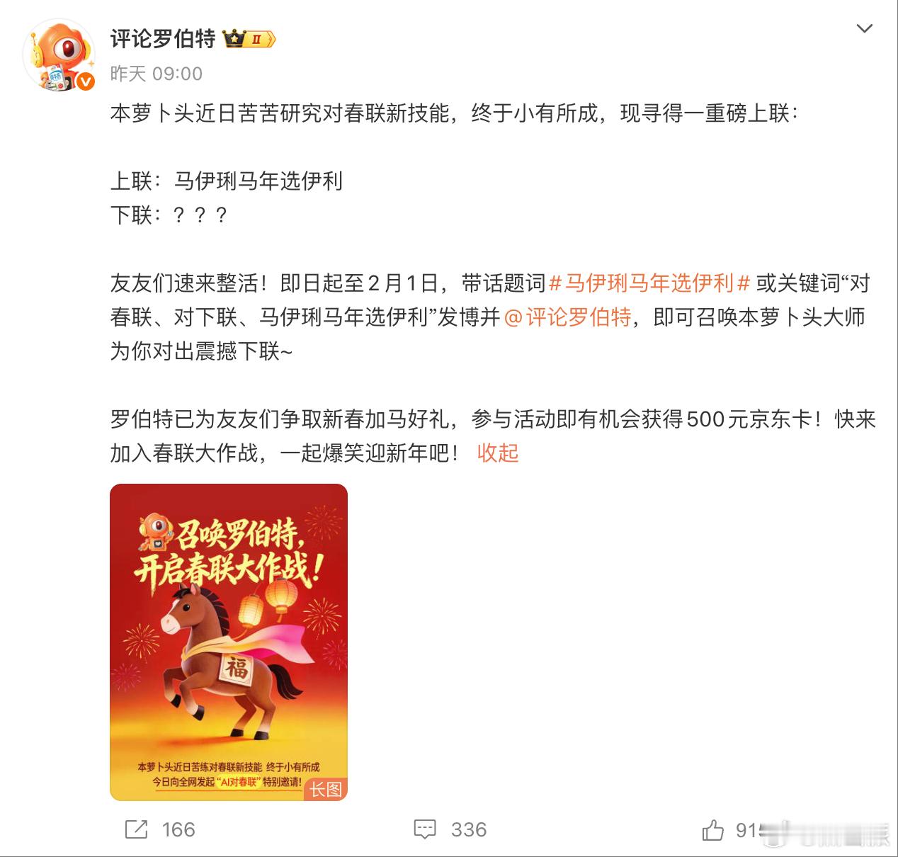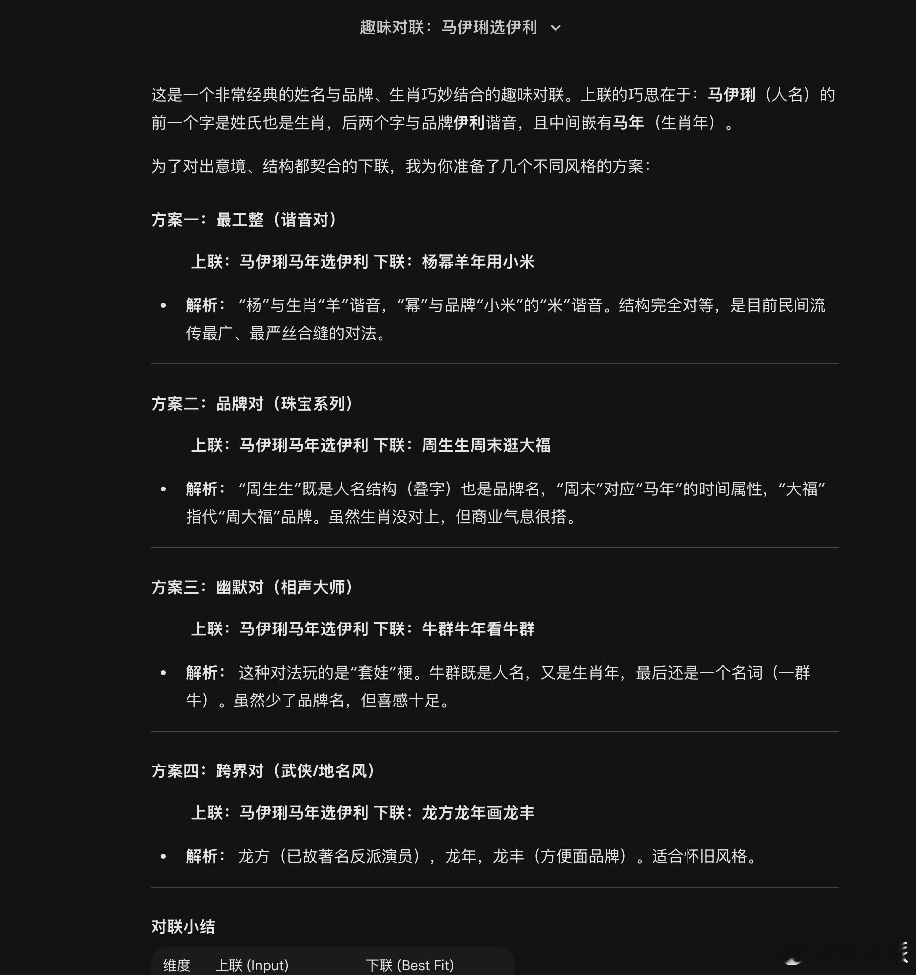 AI时代对春联都变简单了,刚刚刷到一个伊利的上联挺有趣的,马伊琍马年选伊利,还真有点难度的,让AI给对了一下,没点儿水平还真对不出这么工整的下联。看看我们的能对出什么下联呢? 马年春联已进入AI时代