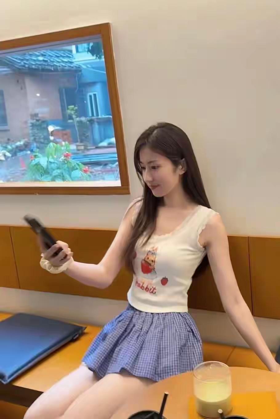 夏日的甜妹日常,卡通背心搭配蓝格短裙,元气又可爱~ 长发披肩,在咖啡馆里随手一拍,都是青春的模样✨