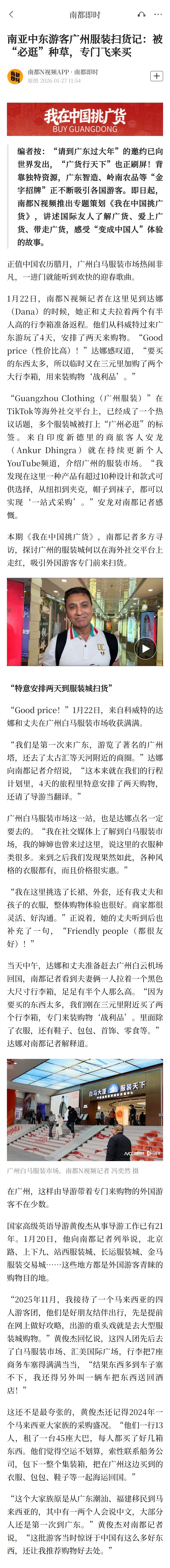 【#南亚中东游客广州服装扫货记#:被“必逛”种草,专门飞来买】#我在中国挑广货#正值中国农历腊月,广州白马服装市场热闹非凡,一进门就能听到欢快的迎春歌曲。1月22日,南都N视频记者在这里见到达娜(Dana)的时候,她正和丈夫拉着两个有半人高的行李箱准备返程。他们从科威特过来广东游玩了4天,安排了两天来购物。“Good price(性价比高)!”达娜感叹道,“要买的东西太多,所以临时又在三元里加购了两个大行李箱,用来装购物‘战利品’。”“Guangzhou Clothing(广州服装)”在TikTok等海外社交平台上,已经成了一个热议话题,多个服装城被打上“广州必逛”的标签。来自印度新德里的商旅客人安龙(Ankur Dhingra)就在持续更新个人YouTube频道,介绍广州的服装市场。“我发现在这里一种产品有超过10种设计和款式可供选择,从纽扣到夹克,帽子到袜子,都可以实现‘一站式采购’。”安龙对南都记者感慨。本期《我在中国挑广货》,南都记者多方寻访,探讨广州的服装城何以在海外社交平台上走红,吸引外国游客专门前来扫货。
