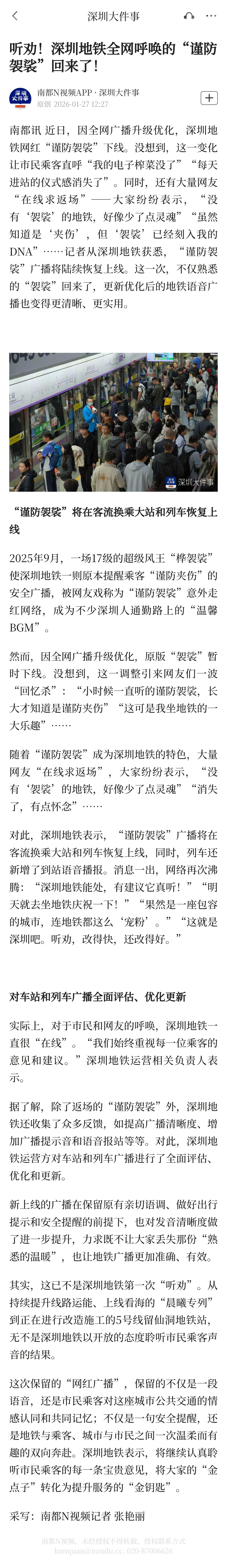 #深圳地铁谨防袈裟又回来了#【听劝!深圳地铁全网呼唤的“谨防袈裟”回来了!】#深圳地铁经典播报悄悄变了#近日,因全网广播升级优化,深圳地铁网红“谨防袈裟”下线。没想到,这一变化让市民乘客直呼“我的电子榨菜没了”“每天进站的仪式感消失了”。同时,还有大量网友“在线求返场”——大家纷纷表示,“没有‘袈裟’的地铁,好像少了点灵魂”“虽然知道是‘夹伤’,但‘袈裟’已经刻入我的DNA”……记者从深圳地铁获悉,“谨防袈裟”广播将陆续恢复上线。这一次,不仅熟悉的“袈裟”回来了,更新优化后的地铁语音广播也变得更清晰、更实用。实际上,对于市民和网友的呼唤,深圳地铁一直很“在线”。“我们始终重视每一位乘客的意见和建议。”深圳地铁运营相关负责人表示。据了解,除了返场的“谨防袈裟”外,深圳地铁还收集了众多反馈,如提高广播清晰度、增加广播提示音和语音报站等等。对此,深圳地铁运营方对车站和列车广播进行了全面评估、优化和更新。新上线的广播在保留原有亲切语调、做好出行提示和安全提醒的前提下,也对发音清晰度做了进一步提升,力求既不让大家丢失那份“熟悉的温暖”,也让地铁广播更加准确、有效。