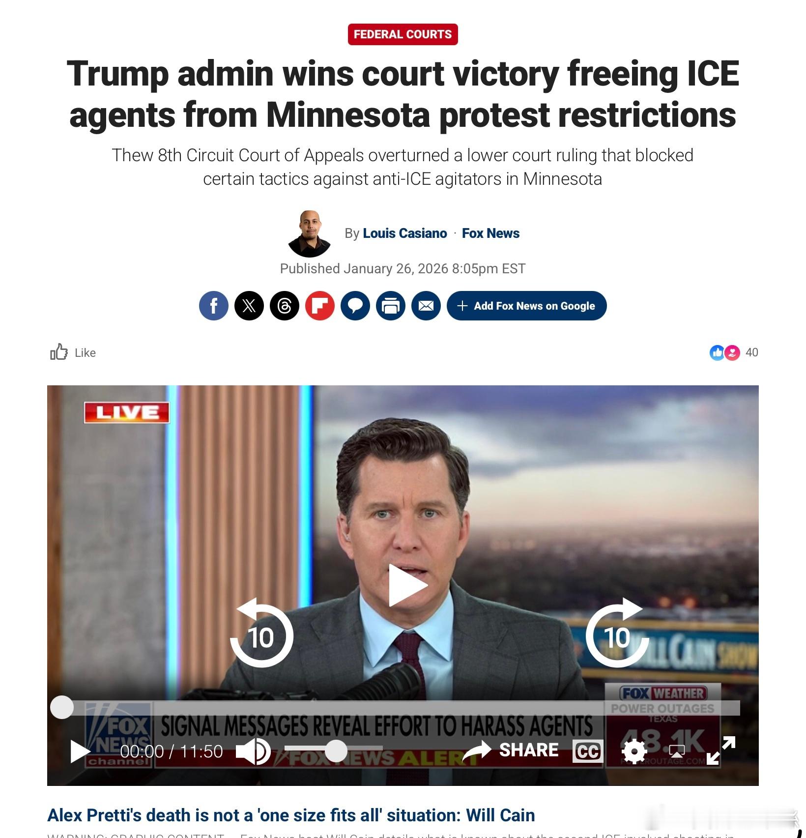 第八巡迴上訴法院支持川普政府,該裁決推翻了下級法院先前的一項禁令,該禁令限制了ICE在沒有合理理由的情況下對反ICE騷亂者採取行動。第八巡迴上訴法院宣稱,「部分騷亂行為是和平的,但大部分並非如此。」這項決定解除了先前對ICE在持續騷亂中執法行動的限制。該訴訟指控聯邦特工侵犯公民權利。司法部長帕姆·邦迪(Pam Bondi)表示,這項裁決保護執法人員在面對「暴力煽動者」事件時的安全。