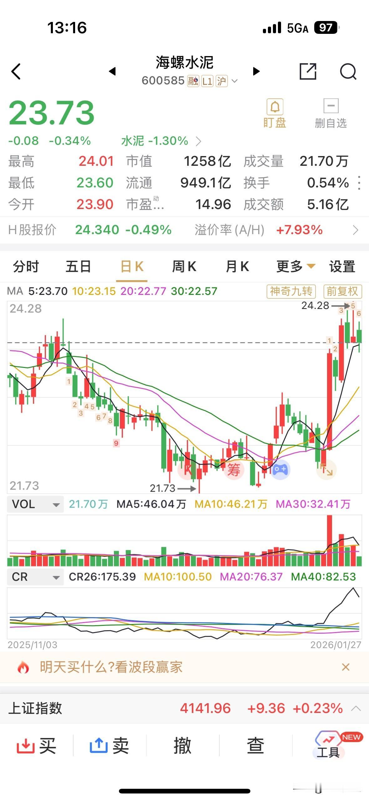 海螺水泥敢用500亿元来做理财产品,纯粹就是为了让投资者看清楚公司的投资价值,看看公司账面上的现金货币是多么充足! 海螺水泥的总市值目前仅1200余亿元,随着地产行业收缩,个股自高位下滑已超60%,但手握充足资金,对于龙头企业来说,无论是并购还是度过寒冬,这就是一个巨大的优势。 而且海螺水泥市净率仅余0.66倍,公司需要打折的资产并不像地产行业那样。 就算如此,公司市盈率仍在低位,股息率高,长年均为A股难得现金现牛。 乐呀财经