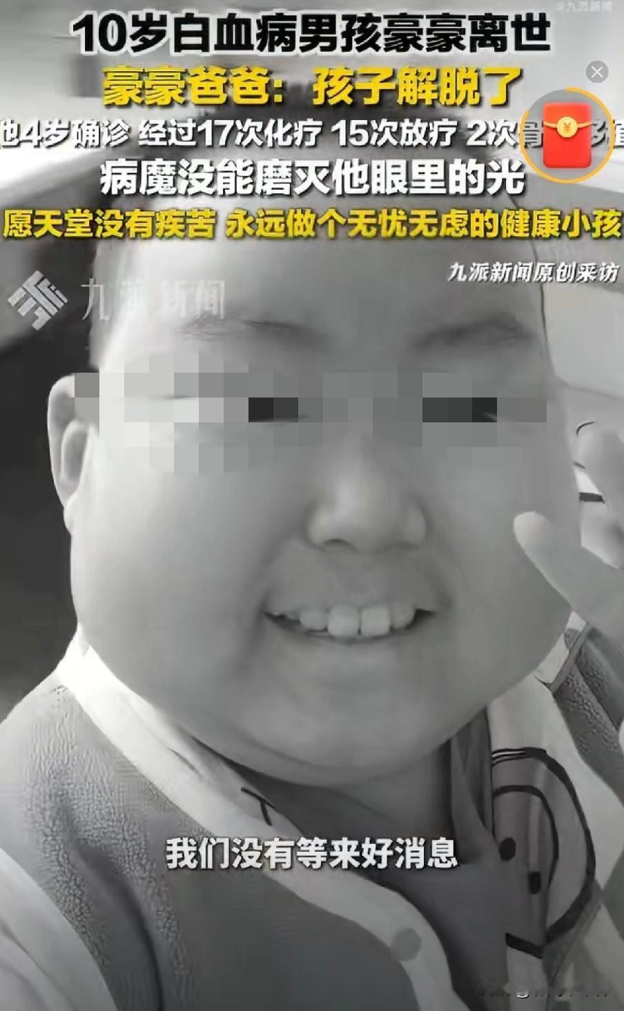 今日凌晨,贵州10岁白血病男孩豪豪离世,曾因对着镜头表达: “你说,王子请恢复健康,永不复发!”而被很多人熟识。从4岁确诊开始,与白血病抗争6年,他终于解脱了! 6年里他17次化疗,15次放疗,2次骨髓移植,小小的身体承受着成年人尚且难以承受的痛苦!即便再痛苦,他仍然坚强乐观,挺过一次又一次的难关,对未来充满了希望,但老天没有给他探索未来的机会,昏睡了几天后,还是离开了。 愿每个孩子都健康快乐,愿天堂没有痛苦!! 白血病患儿豪豪
