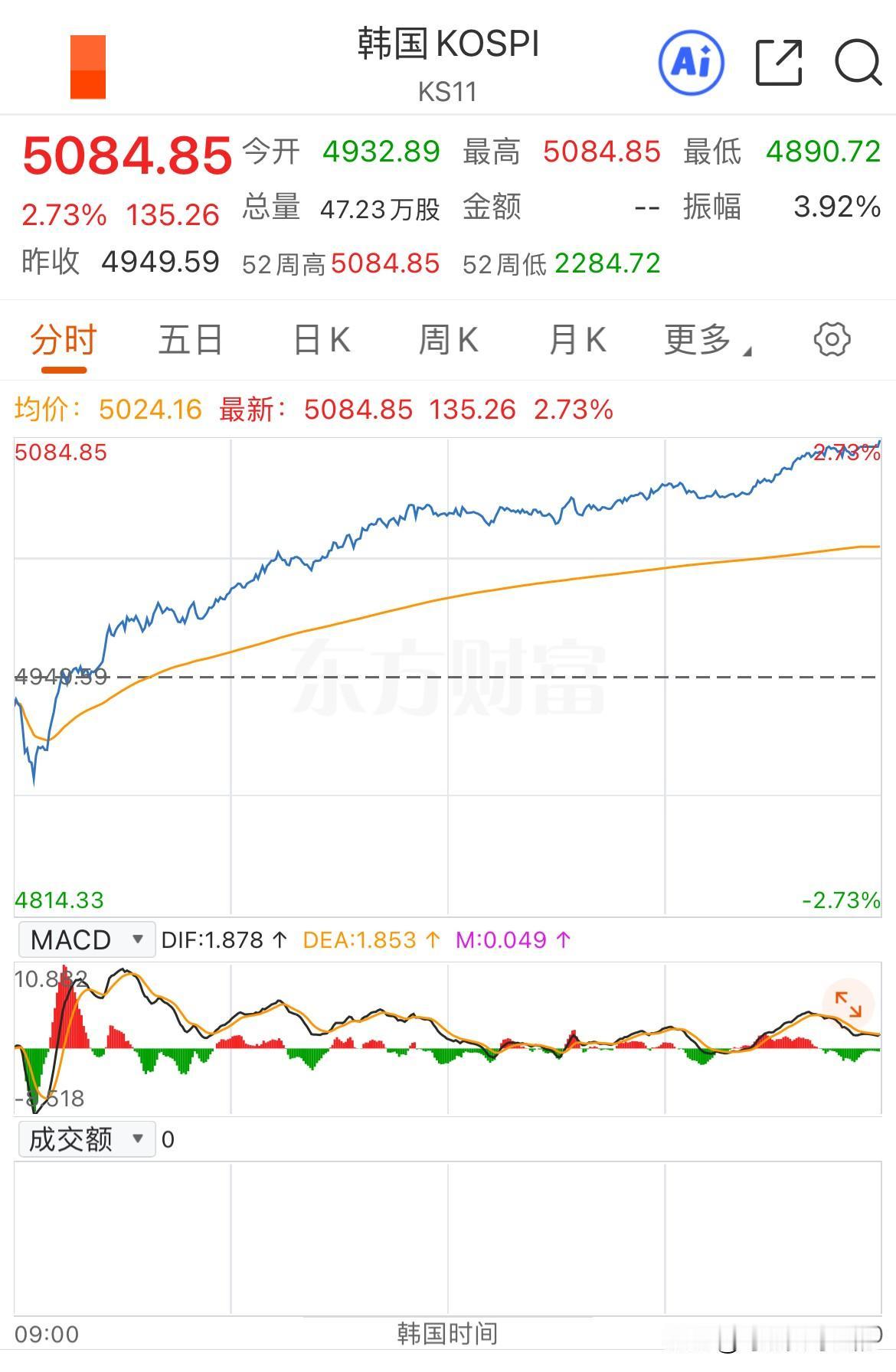韩国股市这合理吗?开盘跌1.1%,收盘涨2.7%,而且收盘就是历史最高点! 今天早上突然有消息传出川普要对韩国加关税,本来还打算看韩国股市的笑话的。结果也确实是低开的,而且开盘后迅速跳水并一度跌超1.1%! 但没想到的是砸了不到10分钟形势就逆转了,指数此后不断回拉并很快翻红!但是这显然还不够,此后又一路飙升至收盘的2.73%,全天除了前十分钟几乎呈单边上涨态势! 韩国股市这一年真的是太强了,不光指数翻了一倍,今天在关税大棒的威胁下居然还能大涨再创新高!真牛!