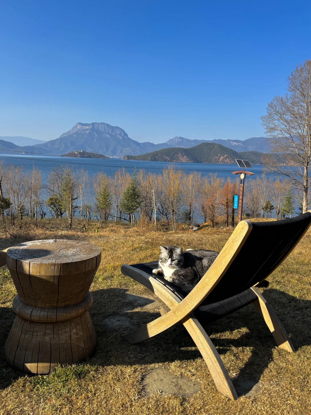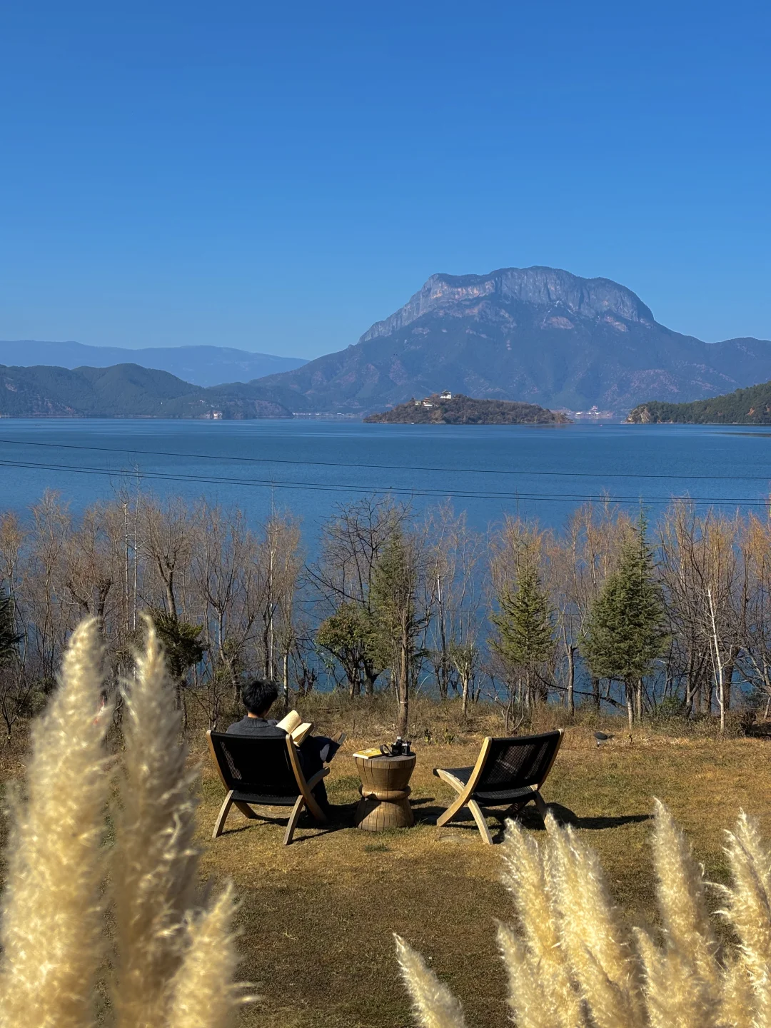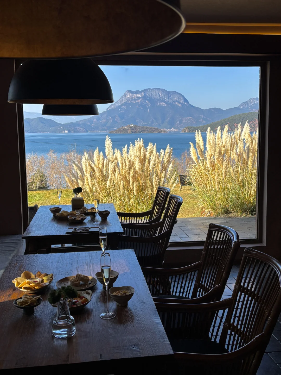 大堂有整面玻璃窗直面泸沽湖与格姆女神山,下午我都在酒店发呆,撸猫、看书、喝下午茶,挺惬意的。