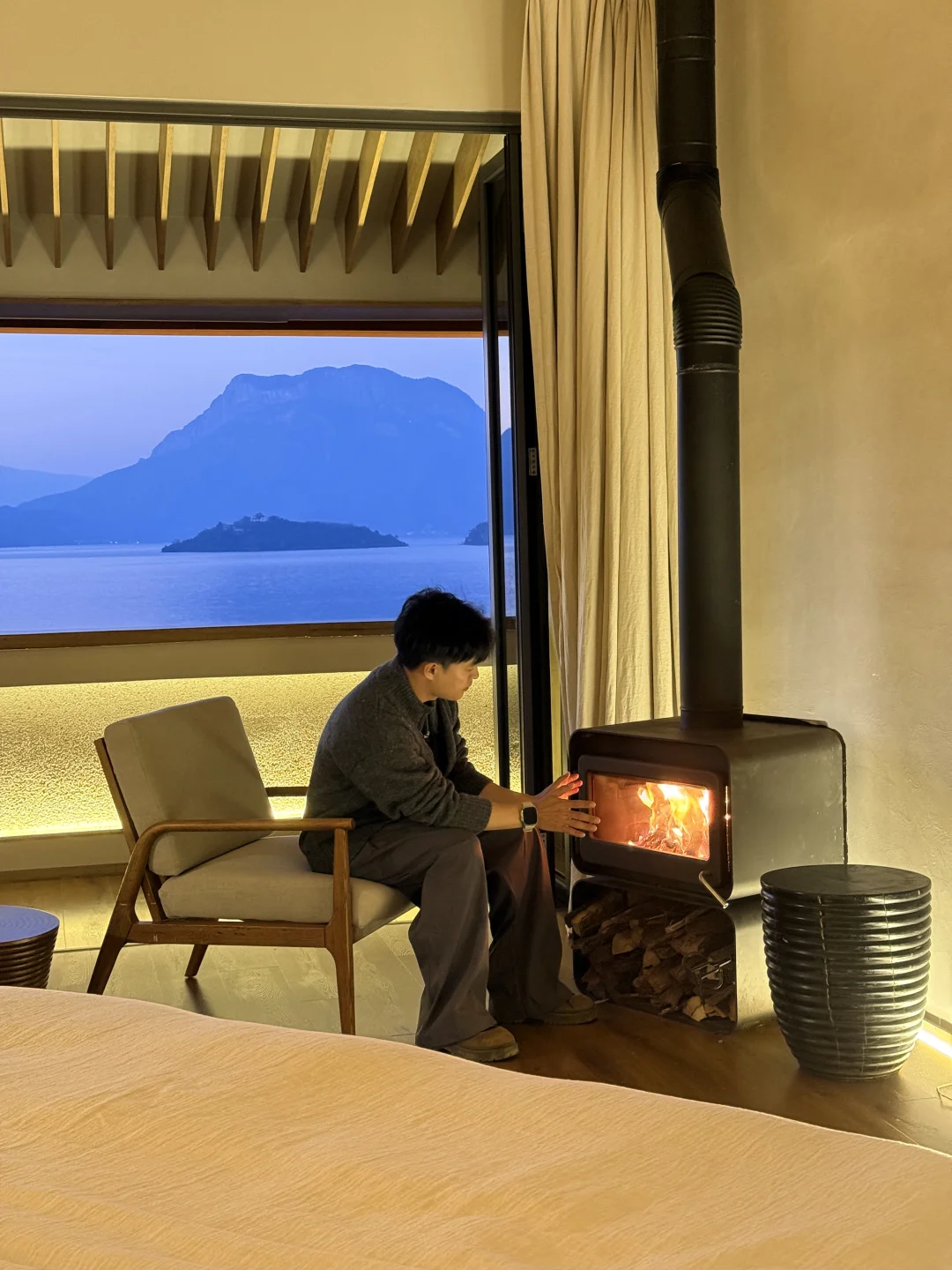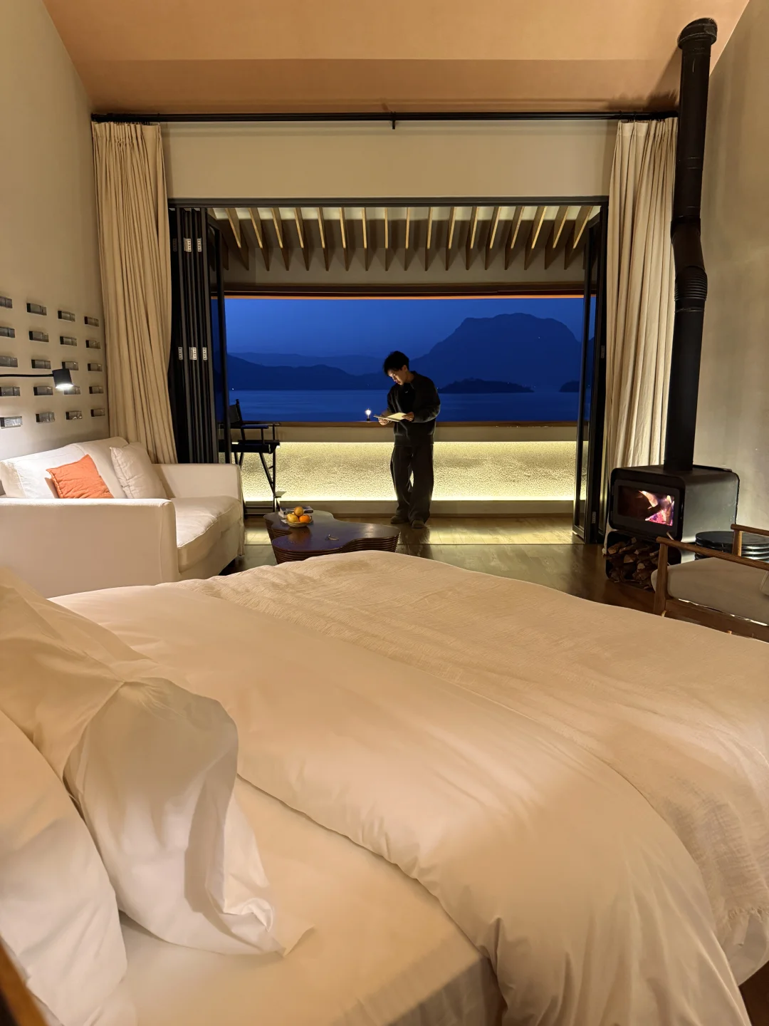 房间的阳台都是采用16:9的规格框住湖与格姆女神山,蓝调时点起火炉,像是住进画里一样。