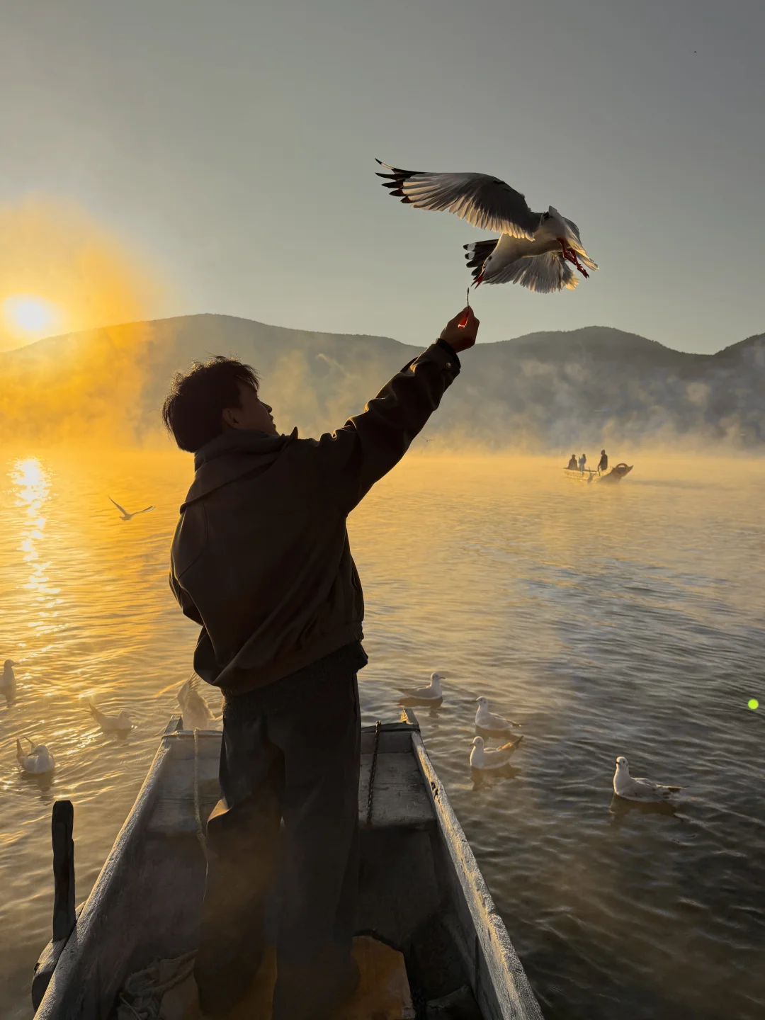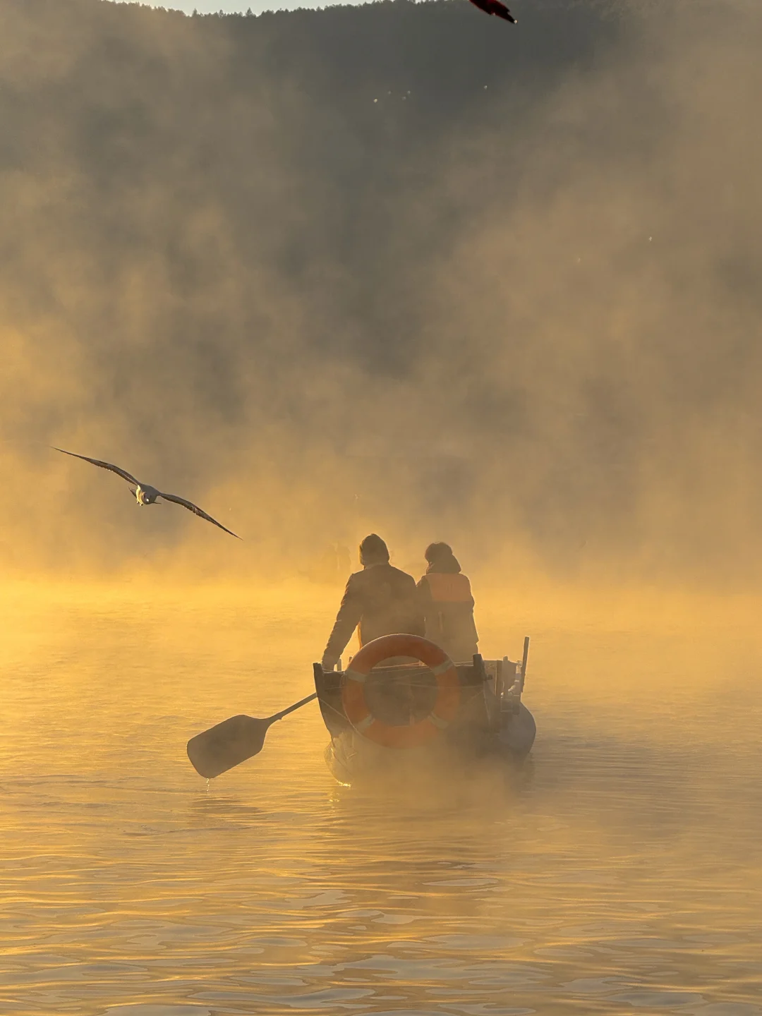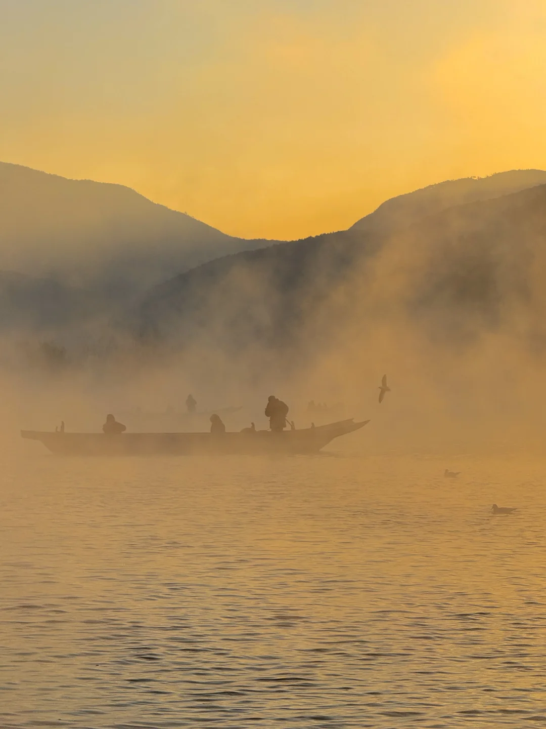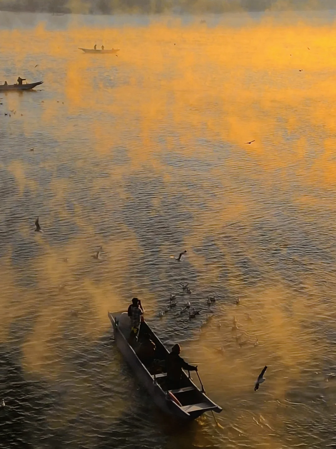 八点登上一艘船,行驶在湖边上,泛起了晨雾,海鸥环船飞行。阳光出来那一刻,晨雾被染成金黄色,震撼到我们全船人都在尖叫。