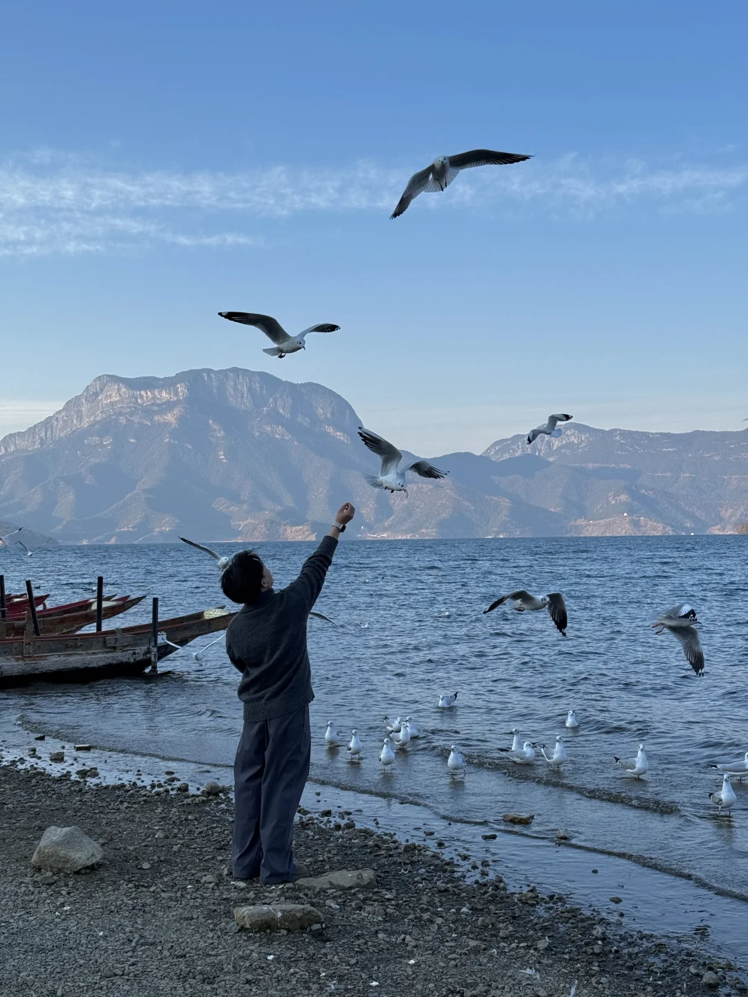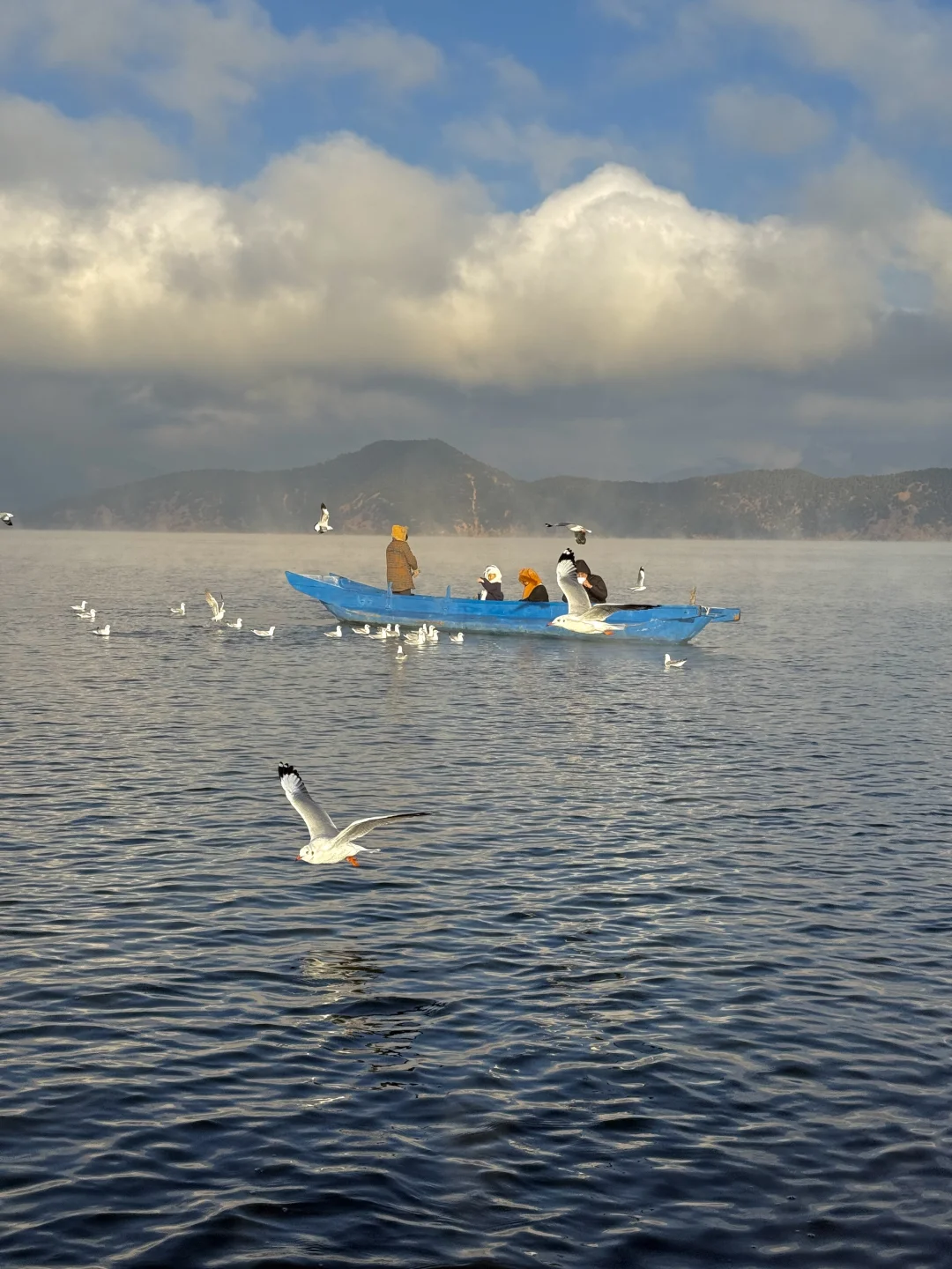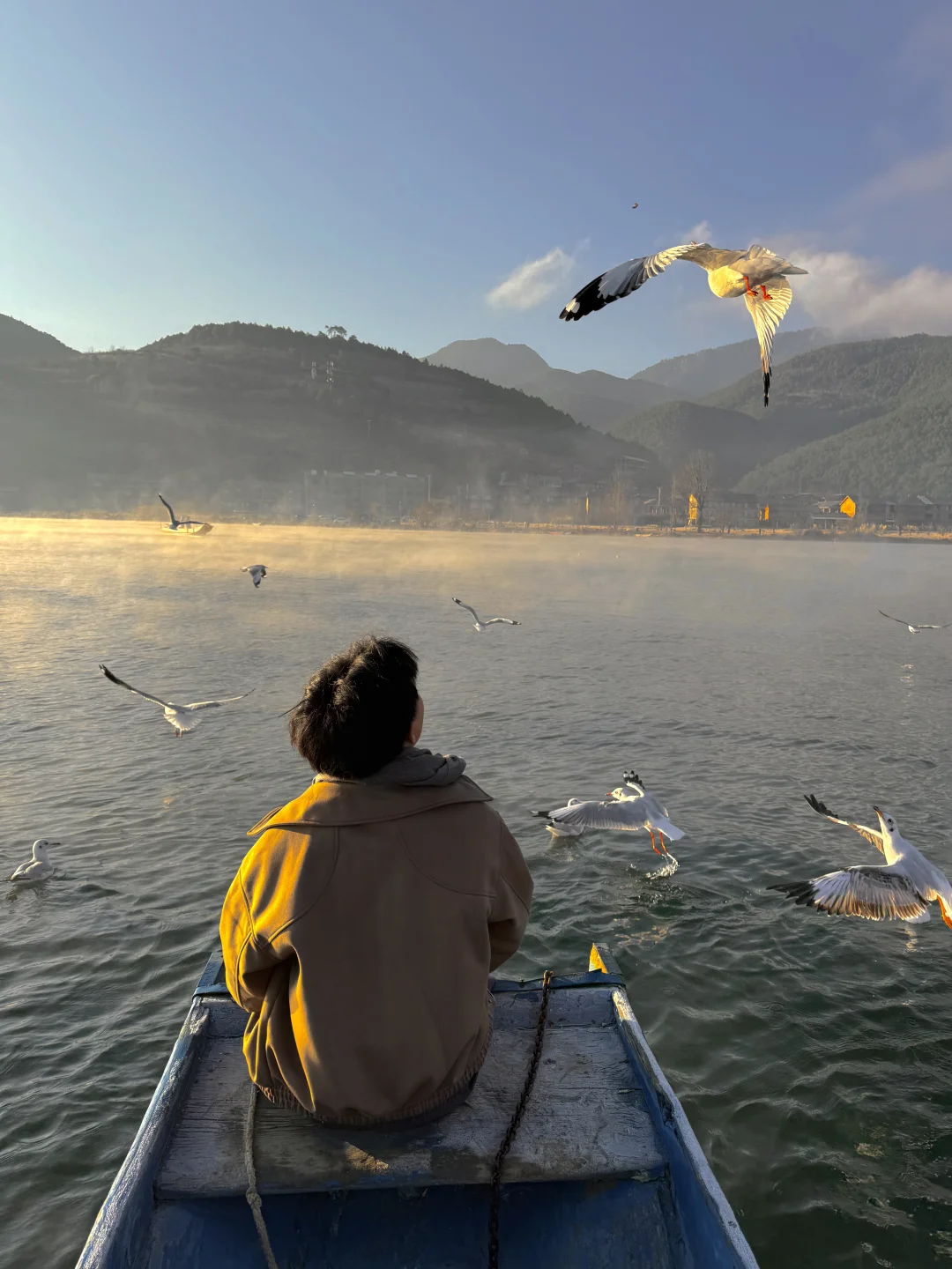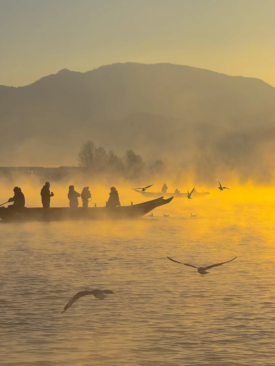 八点登上一艘船,行驶在湖边上,泛起了晨雾,海鸥环船飞行。阳光出来那一刻,晨雾被染成金黄色,震撼到我们全船人都在尖叫。