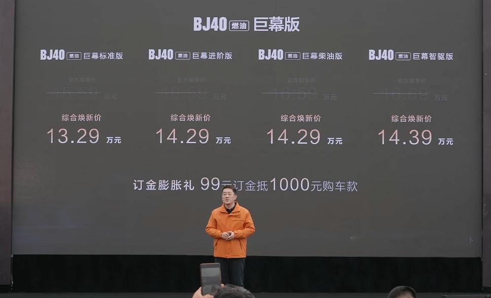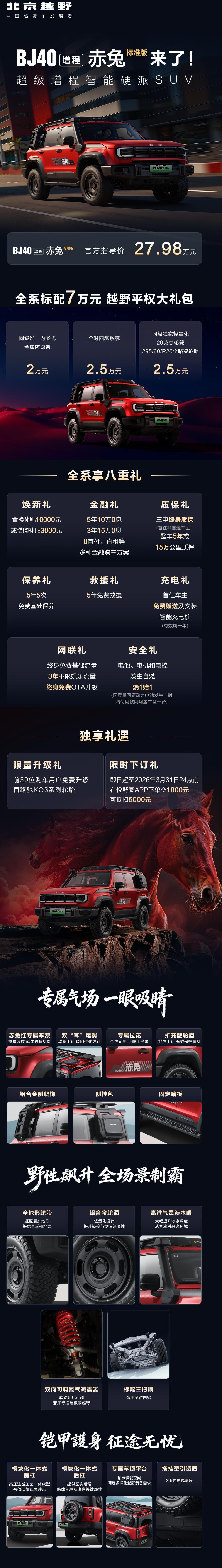1月27日,BJ40增程赤兔版开启交付,售价27.98万元;BJ40燃油巨幕综合