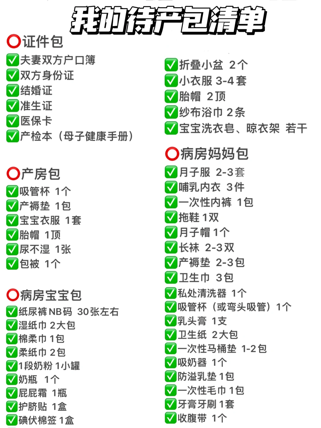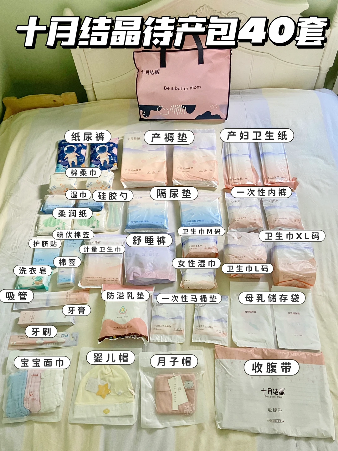说到待产包,36周就要让老公跟着一起准备了,提前熟悉每一样东西,不要到时候手忙脚乱,翻得满地都是,我当时直接买的十月结晶40件套待产包,好用不贵,基本要带的里面都有,产后护理、新生儿护理也都能用到。这种专门给孕妈和宝宝做的,用起来会比较放心,也不用去东拼西凑了。具体带些什么如何分装,参照我最后一张待产包清单图就行。