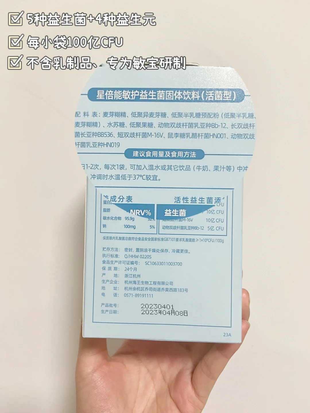 ✅小树苗之前总是闹肚肚、还有小红点。后来我做了大量功课以后给他买了海王星倍能敏护益生菌。它是复合敏护型益生菌,里面含5种婴儿可食用菌株:动物双歧杆菌、长双歧杆菌长亚种BB536、短双歧杆菌M-16V、鼠李糖乳酪杆菌HN001、动物双岐杆菌乳亚种HN019,和4重益生元:低聚异麦芽糖、低聚半乳糖预配粉 (低聚半乳糖麦芽糊精)、水苏糖、低聚果糖为菌菌提供战粮。帮宝宝建立美好的肚肚环境,宝宝的过M反应也好多了。里面不含乳制品,敏感宝宝或乳糖不耐受宝宝可以放心吃。里面是小袋独立包装,粉剂方便冲服,每小袋含活菌100亿CFU,活菌数量很够。