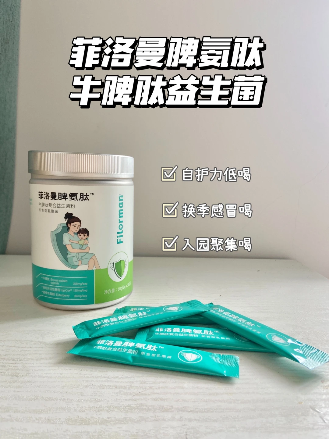 ⭕️此外,给大家科普一个风很大提升自护力的营养成分:牛脾肽,它是从新鲜、健康的猪脾脏或者牛脾脏中提取出的多肽和核苷酸混合物。研究表明:这个成分对于孩子调节保护力失衡、增强身体素质有很好的效果。我最近也给小树苗安排了,我选的是菲洛曼脾氨肽,每袋含有了300mg的牛脾肽,还添加了食用非活性酵母和接骨木莓,都是提升宝宝自护力的好成分,提升宝宝三道mianyi防线。粉末质地,37度以下温水冲服,淡淡的清香,好喝不甜,宝宝很喜欢,也分享给大家。
