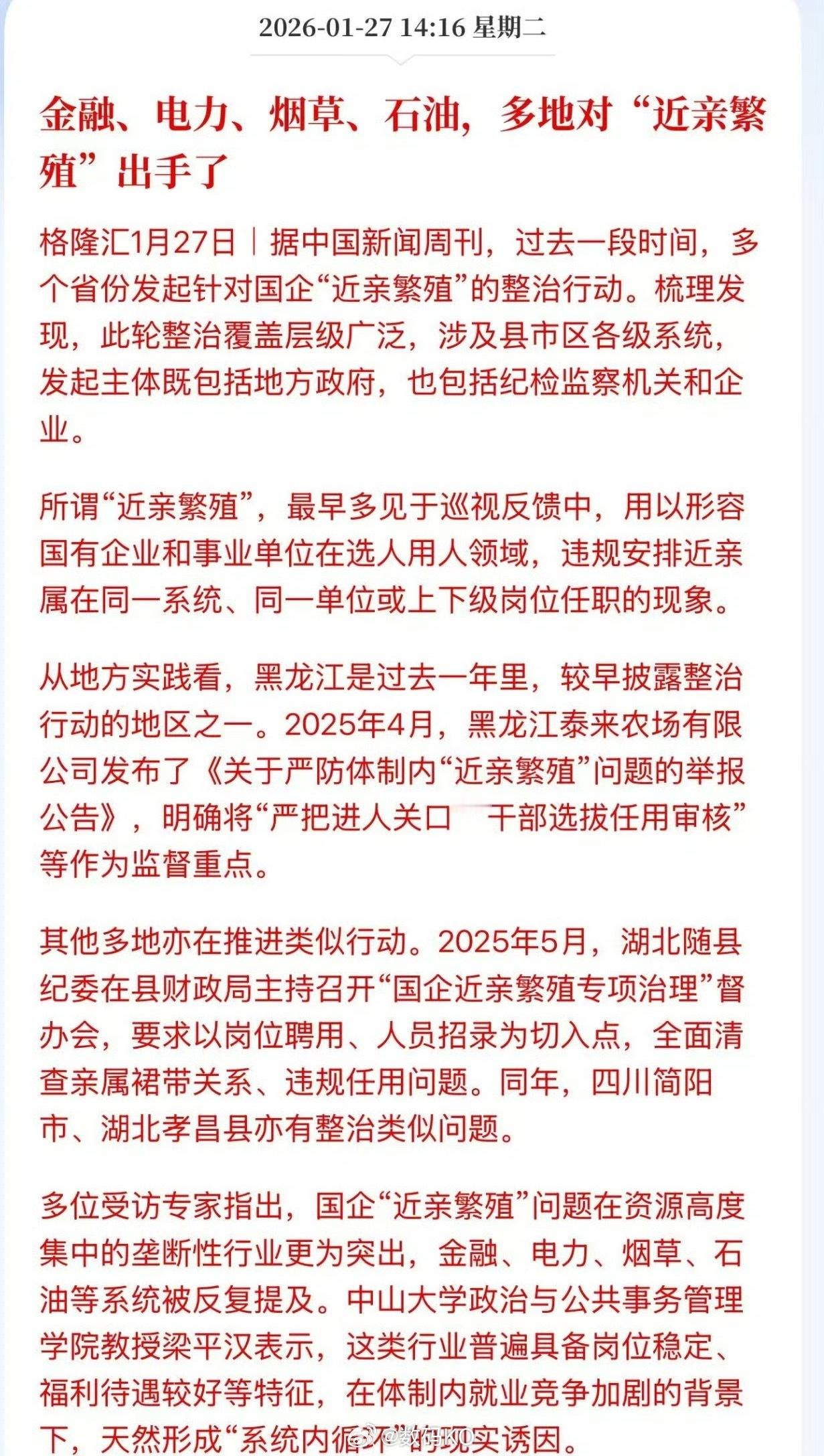 多地对国企近亲繁殖出手了据中国新闻周刊,过去一段时间,多个省份发起针对国企“近亲繁殖”的整治行动。梳理发现,此轮整治覆盖层级广泛,涉及县市区各级系统,发起主体既包括地方政府,也包括纪检监察机关和企。更为隐蔽的方式是交叉安排,例如,将子女或亲属安排至其他系统,从形式上绕开制度设定的防火墙。