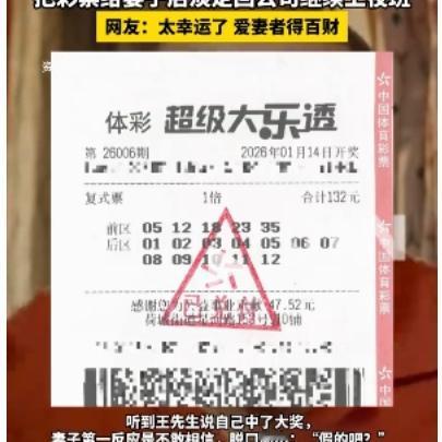 中800万不辞职!苏州大哥神操作刷屏,640万规划太清醒 江苏苏州38岁操作工10元机选命中800万头奖,扣税640万到手后交妻保管,次日准时上班,这波操作引爆全网。 大哥在苏州打工15年,月薪8000多,和超市收银的妻子住70平老房。购彩十年每月花费不超50元,中奖当晚陪娃写完作业才告知妻子,夫妻约定不打乱生活。兑奖当日他照常车间干活,同事直到妻子送鸡汤才知情,面对辞职劝说和老板休假提议,他坚持做完手头订单。640万已规划妥当:老家买房接父母,留足孩子教育金,剩余稳健理财,夫妻二人均不辞职。 近70%大奖得主5年内陷财务危机,这位大哥却守住本心。财富是生活的助力而非颠覆,他的选择戳中无数人。你若中大奖会辞职吗?欢迎评论区分享看法!