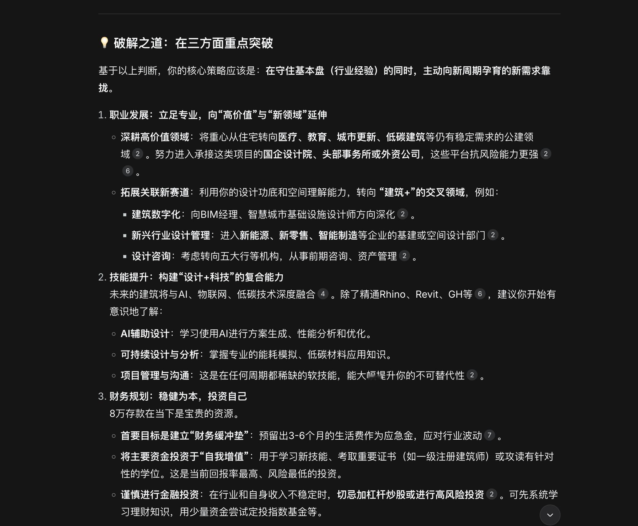 建筑行业已经是夕阳产业了,未来的固定投资将会继续缩水。你知道当下的存量房子足够卖多少年吗?你所说的公共性建筑,医疗康养、学校这些都是在康波周期繁荣的阶段,我们的政府、社会企业手上有足够利润和盈余才去兴建商业办公楼、学校、医院等等。你的建议过于保守且没有远见,如果我继续在建筑行业中,我将错失我翻身的美好年纪,为什么说 28、29 岁是转型的美好年纪。我没有结婚,没有房贷车贷,我一无所有,反而是我最大的机遇。如果我继续在建筑行业中,我的沉默成本将无限放大。我放弃原有的固定轨迹,用之前在建筑行业的所用所学,适配在其他领域,我用建筑师敏锐的观察力、执行力、数据分析能力,适配各个领域。现在,我发现当下所有的实体行业都是产能过剩且内需不足,只要涉及消费端的企业都降面对增长疲软的困境。我不想继续在这场混沌中迷茫,我想打破这个梦境,是打破这个梦境的理论依据仍然建立于我的个人世界观分析,不破不立,我将继续前行。谢谢你DeepSeek,你的意见很好客观,但我不会采纳。