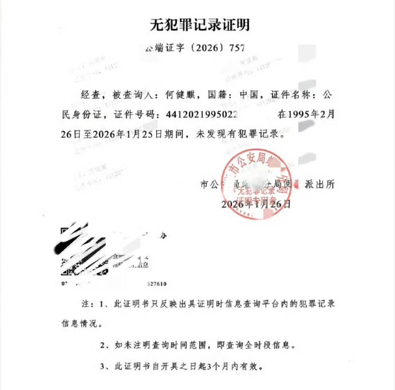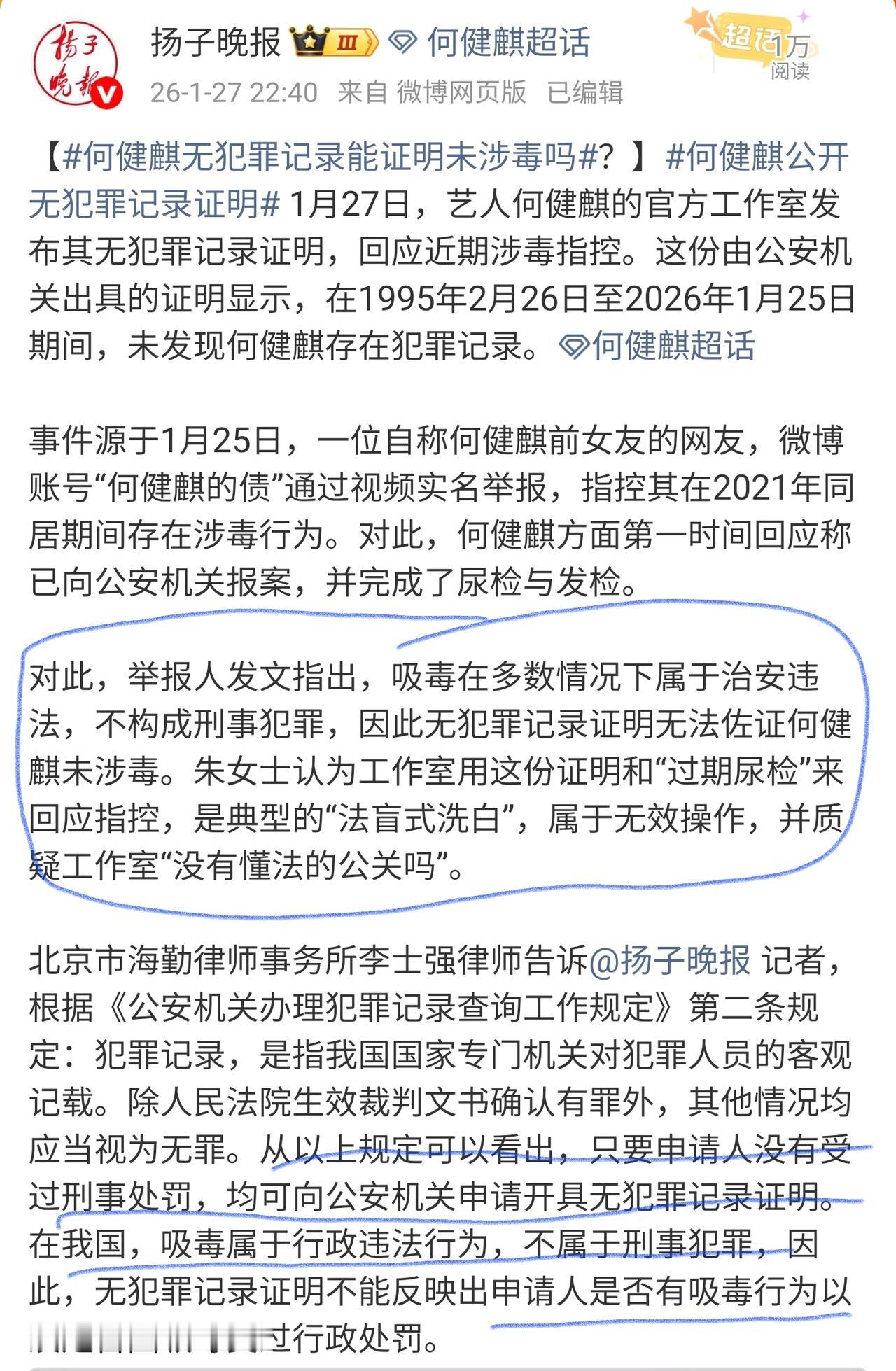 前女友突然跳出来实名举报涉毒。 结果人家48小时内直接甩公安无犯罪记录证明+尿检发检报告,这反应速度和底气还不够说明问题吗? 说无犯罪记录证明没用的人,太草率了。 就算无犯罪记录证明,不能排除何健麒是不是吸毒。 但是人家在网上能晒出这段证明。 就说明不怕被官方打脸。 不怕被有关部门通报出相关事情来。 反观举报人,就靠一段情绪激动的视频,没任何实锤证据,张口就来“同居涉毒”。 到底是谁在法盲式抹黑啊? 实名举报不是造谣的免罪金牌,捏造事实诬告可是要负法律责任的 ! 何健麒主动报案、配合检测、公开官方证明,每一步都走在法律框架内,这明明是坦荡自证,怎么就成“洗白”了? 我支持何健麒维权,也期待警方进一步通报,还人家一个清白!何健麒无犯罪记录证明