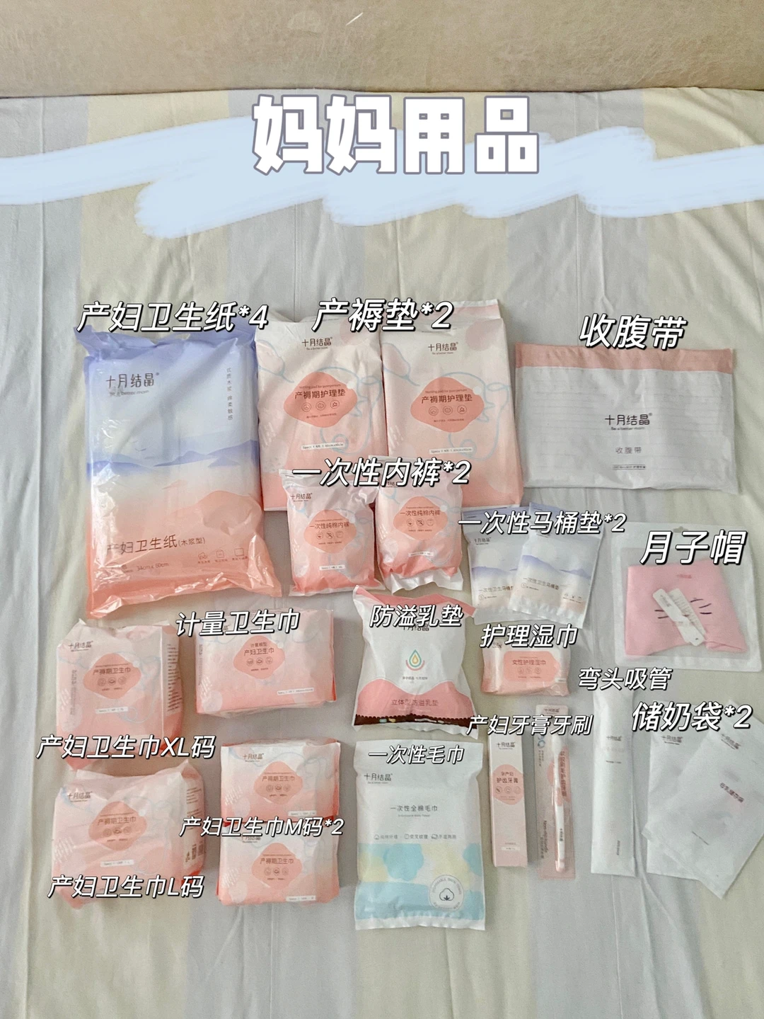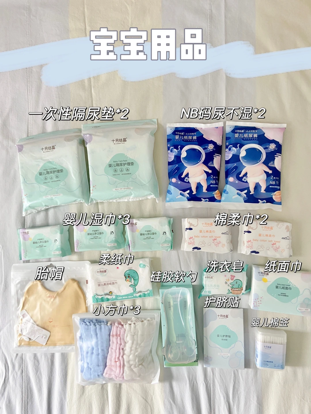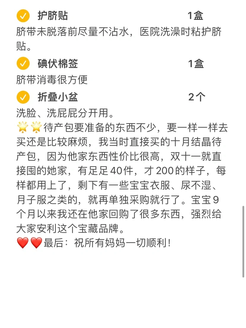 🌟🌟待产包要准备的东西不少,要一样一样去买还是比较麻烦,我当时直接买的十月结晶待产包,因为他家东西性价比很高,双十一就直接囤的她家,有足足40件,才200的样子,每样都用上了,剩下有一些宝宝衣服、尿不湿、月子服之类的,就再单独采购就行了。宝宝9个月以来我还在他家回购了很多东西,强烈给大家安利。