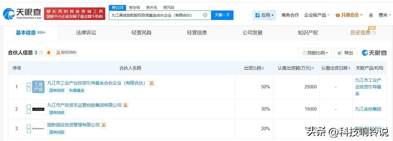 【中国国新等在九江成立股权投资基金 出资额5亿】 天眼查App显示,近日,九江鼎成启航股权投资基金合伙企业(有限合伙)成立,执行事务合伙人为国新国证投资管理有限公司,出资额5亿人民币,经营范围为以私募基金从事股权投资、投资管理、资产管理等活动,由九江市工业产业投资引导基金合伙企业(有限合伙)、九江市产投资本运营控股集团有限公司、中国国新旗下国新国证投资管理有限公司共同出资。 天眼查信息: