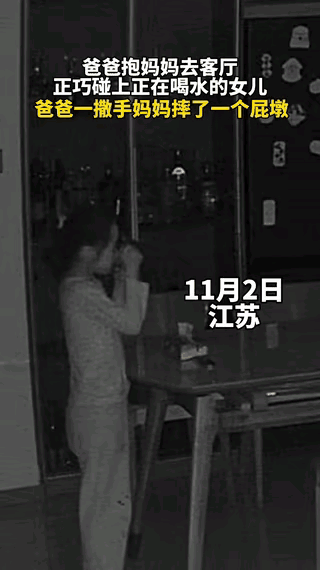 爸爸抱妈妈去客厅 没想到碰到了女儿 女儿口渴在客厅喝水