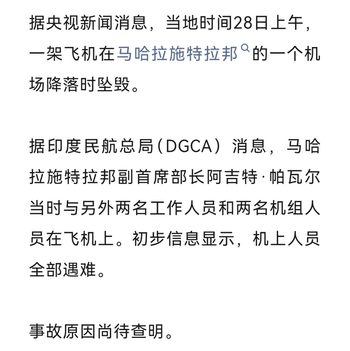 印度一飞机失事当地时间1月28日上午,印度马哈拉施特拉邦一架庞巴迪公务机从孟买起飞,在浦那一机场降落时失控坠毁并起火。机上共6人,包括该邦副首席部长阿吉特·帕瓦尔、安保人员及机组人员,目前已确认全部遇难。印度民航部门已介入,事故具体原因仍在调查中,愿逝者安息。印度一飞机失事