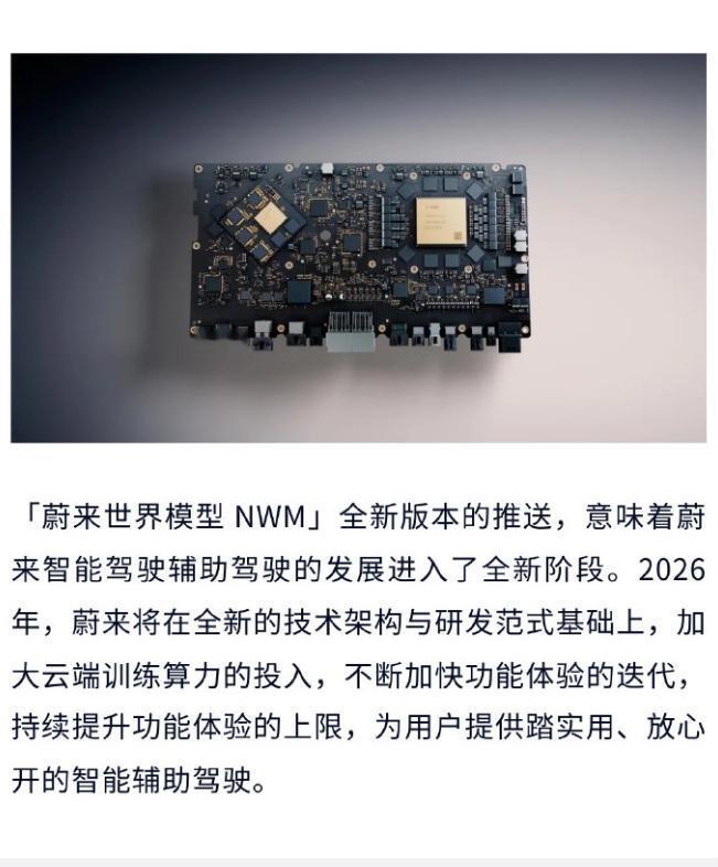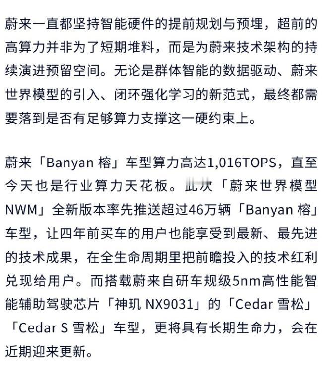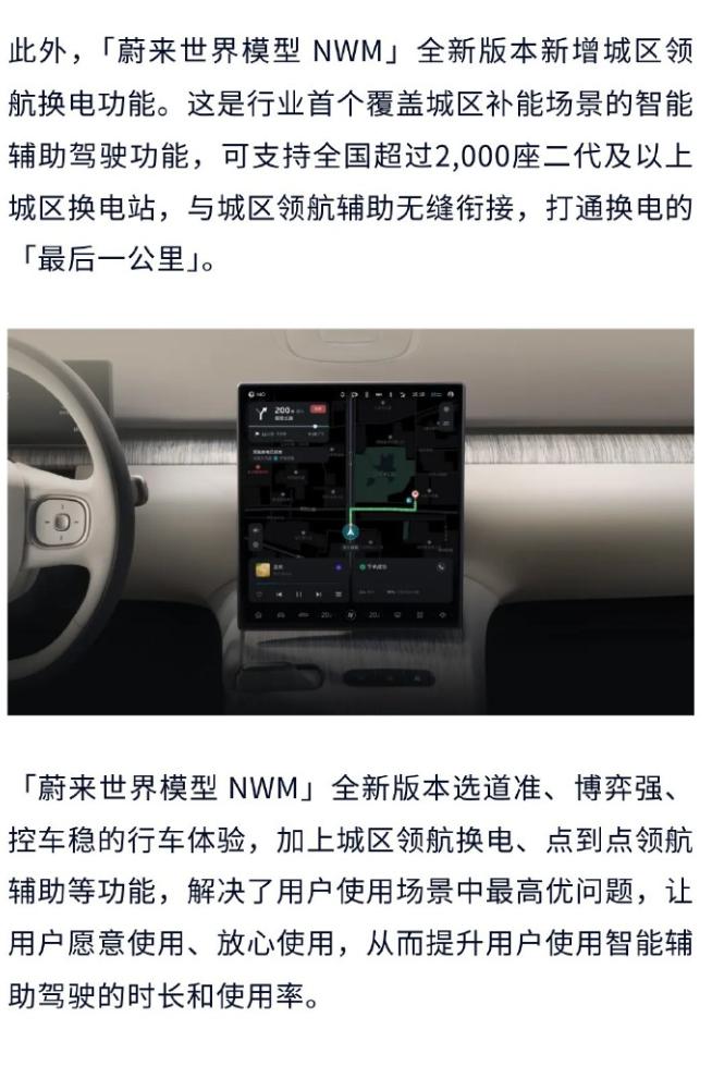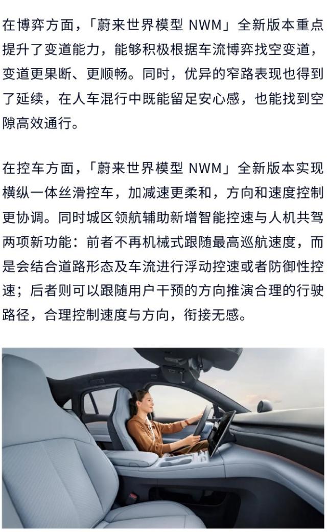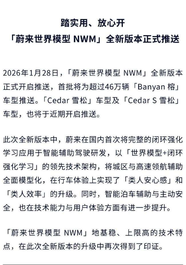 蔚来NWM 2.0 Banyan3.3.0今天推送,车主们都收到了吗? 官方发了长图,讲的有点多,咱帮着过滤一下,看看主要升级了哪些东西: -高速全域领航辅助升级:匝道选路、变道更准,施工避让优化,减少重刹。 -新增 ETC 车道识别热力图:收费站自动高亮 ETC 通道,通行更高效。 -随心智行升级:停车场自主寻路,可理解更复杂指令。 -城区领航全面优化:新增智能防御控速,掉头、变道、择道、过路口能力大幅提升,驾驶更类人。 -新增城市领航换电:全国二代及以上换电站,支持全程自动化补能。 -新增NWM人机共驾模式:可随时人工干预调整行驶方向。 -车道居中辅助升级:路口左右转合规通行,施工避让、直行过路口体验更佳。 网上的测试视频也多起来了,小伙伴们感兴趣可以翻一翻,说了很久的城区领航换电终于上了,还有人机共驾模式,比上个版本更激进,好不好用咱们等等真实车主的反馈。【来自懂车帝车友圈】
