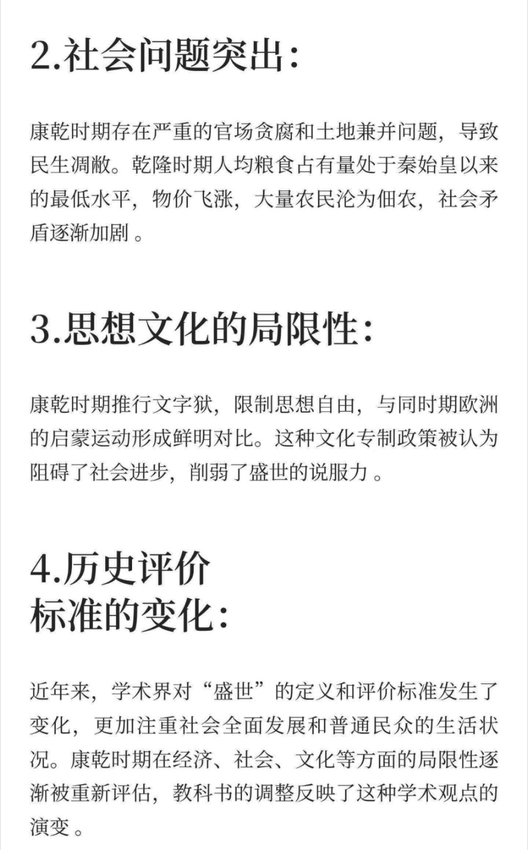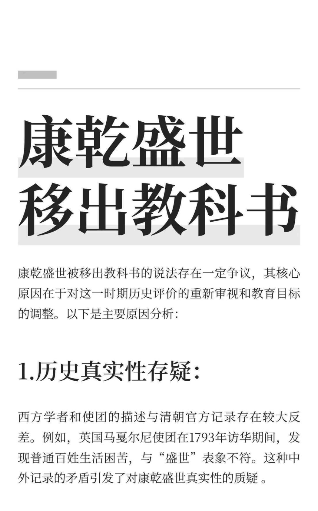 康乾盛世被移出教科书,因中西史料记载相悖,其真实性存疑。彼时官场贪腐、民生凋敝,文化专制禁锢思想,社会矛盾尖锐。加之史学评价标准更新,对这一时期的历史重新评估,促成教科书的内容调整。