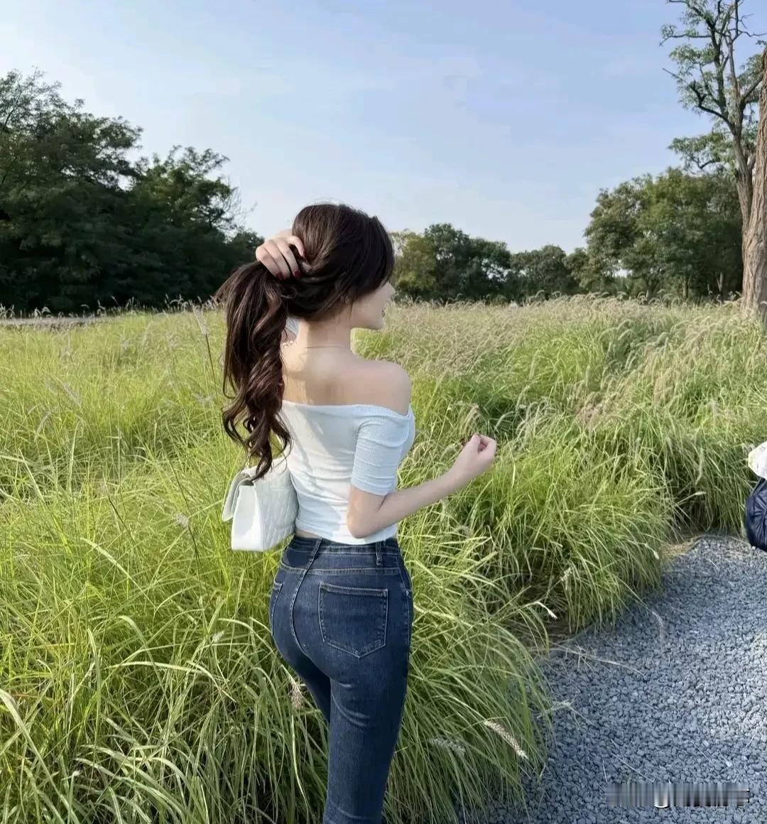 元气少女在自然中漫步,白色羽绒服与牛仔裤的清新搭配,尽显青春活力!🌿