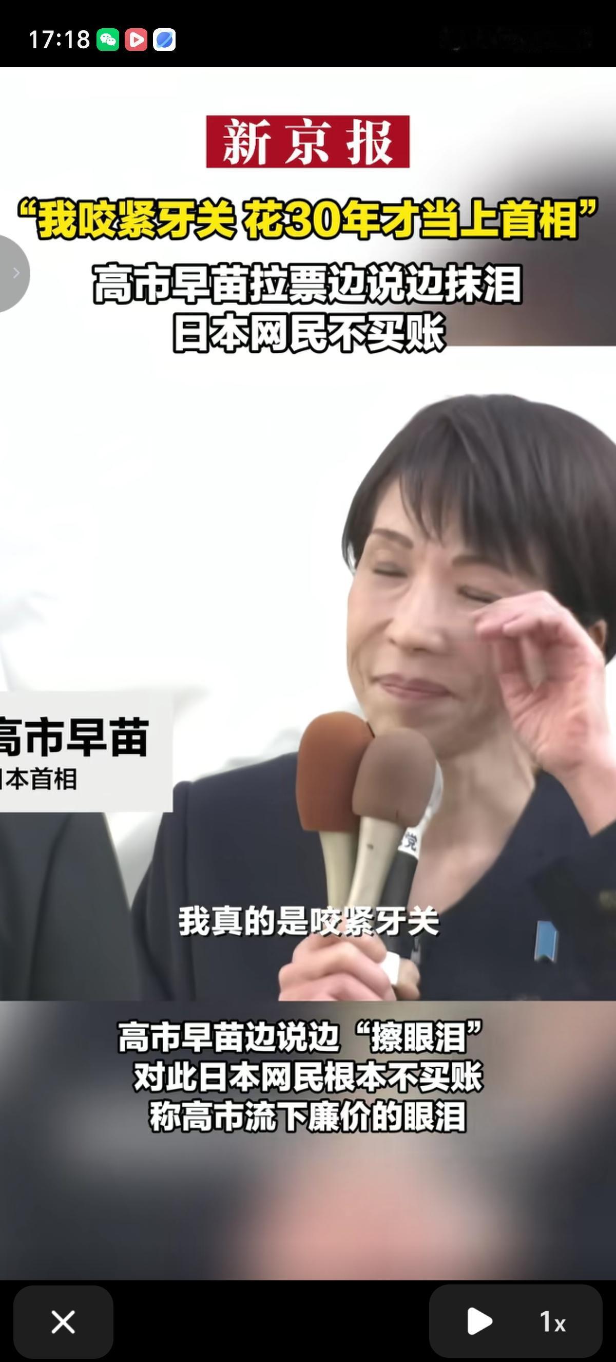 “我真的是咬紧牙关,花了30多年,好不容易才当上首相”。边说边擦眼泪,就是没让人看见眼泪在哪里,这是解散众议院后后悔了吗? 高市早苗风风火火解散众议院,几名前首相并排坐在一起,其他人都脸色难看,只有石破茂还笑的出来。 所有党派只有半个月时间准备选举,时间短、节奏快、风险极高,这种操作在日本政坛并不常见。因为提前选举,赢了是首相个人的功劳,输了却是整个执政党的责任,连老盟友麻生太郎没有提前通知,石破茂除了看戏就是看戏,他早就被挤出权力中心了。 台湾时事评论员说对日本好,是让高市早苗下台。对日本不好是高市早苗继续干,其实你要日本这个国家走错道路,然后付出代价,那就是让高市早苗继续干。
