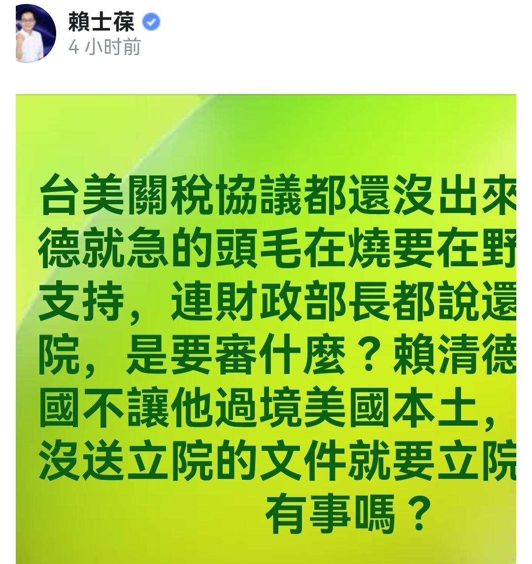 尴尬了!赖士葆呛赖清德关贸协议还没出来就逼立院通过 网友酸:你女儿在美国耶! 国民党立委赖士葆今(28日)针对赖清德喊话在野支持台美关贸协议一事开炮,批评赖清德因“过境美国”受挫而“急得连没送进立院的文件都要立院通过”。未料此番言论引发网友强烈反弹,脸书留言区遭超过千则留言灌爆,网友痛批“你女儿在美国当牙医,有什么资格反对?”并纷纷截图准备向美国在台协会(AIT)检举。 赖士葆批:急得连没送的文件都要过 针对台美关贸协议争议,赖士葆发文批评赖清德,指因美国不让其过境本土,导致赖清德“急得连没送立院的文件就要立院通过”,并质疑“有事吗?”,引发轩然大波。 网友灌爆:你女儿在美国,凭啥反对? 然而,赖士葆的批评并未获得网友认同,反而引爆众怒。大批网友涌入其脸书留言区,直指其“双重标准”,痛批“你女儿在美国当牙医,有什么资格反对台美协议?”、“凭什么你小孩住美国?” 更有网友讽刺道“已截图转给AIT”、“请AIT把他女儿驱逐”,甚至有人提醒“AIT新规定,申请签证要查社交媒体,已截图备份”。舆论认为,赖士葆平日主张“疑美论”、“亲Z”立场,却让女儿持美国护照生活,被质疑为“嘴炮”、“双标政客”。 也是正常的,两边都一样,谁也别笑话谁。