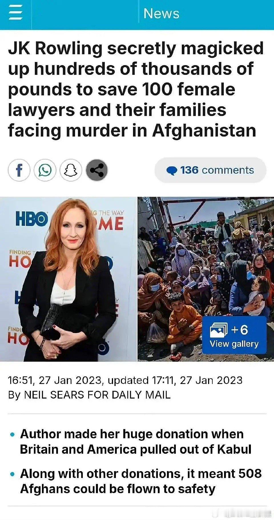 J.K.罗琳捐赠数百万英镑,营救上百名在阿富汗面临被谋杀的女性律师及家人逃出阿富汗